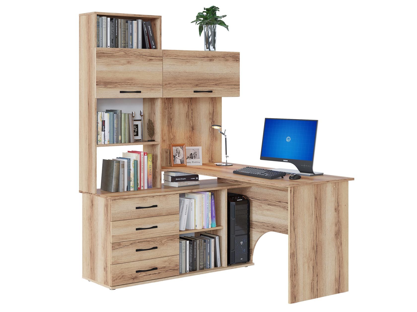 Многофункциональный компьютерный стол КСТ-14.1 для домашнего кабинета или офиса. Модель сочетает в себе широкий компьютерный стол с размером столешницы 1350 мм, тумбу с ящиками, полками и нишей под системный блок. Высокая надстройка имеет открытые полки и два закрытых шкафа. Двери шкафчиков открываются вверх. Внутренний размер ящиков — 456 х 346 мм. Преимущества:вместительный — большое количество полочек и ящиков позволяет хранить всю необходимую канцелярию в одном месте; стильный — впишется практически в любой интерьер и станет его украшением; широкий — размер столешницы составляет 1350 мм и позволяет поставить не только монитор, но другие предметы, необходимые для работы или учебы. Такая модель компьютерного стола позволяет организовать максимально удобную и функциональную рабочую зону. Изделие выполняется из ЛДСП толщиной 16 мм, края обработаны кромкой ПВХ 0,4 и 2 мм. Задняя стенка — ДВП серого цвета. Ручки выполнены из металла. На столешнице имеется отверстие под провода. В комплект входит заглушка. Рекомендуем сохранить инструкцию по сборке (паспорт изделия) до истечения гарантийного срока.