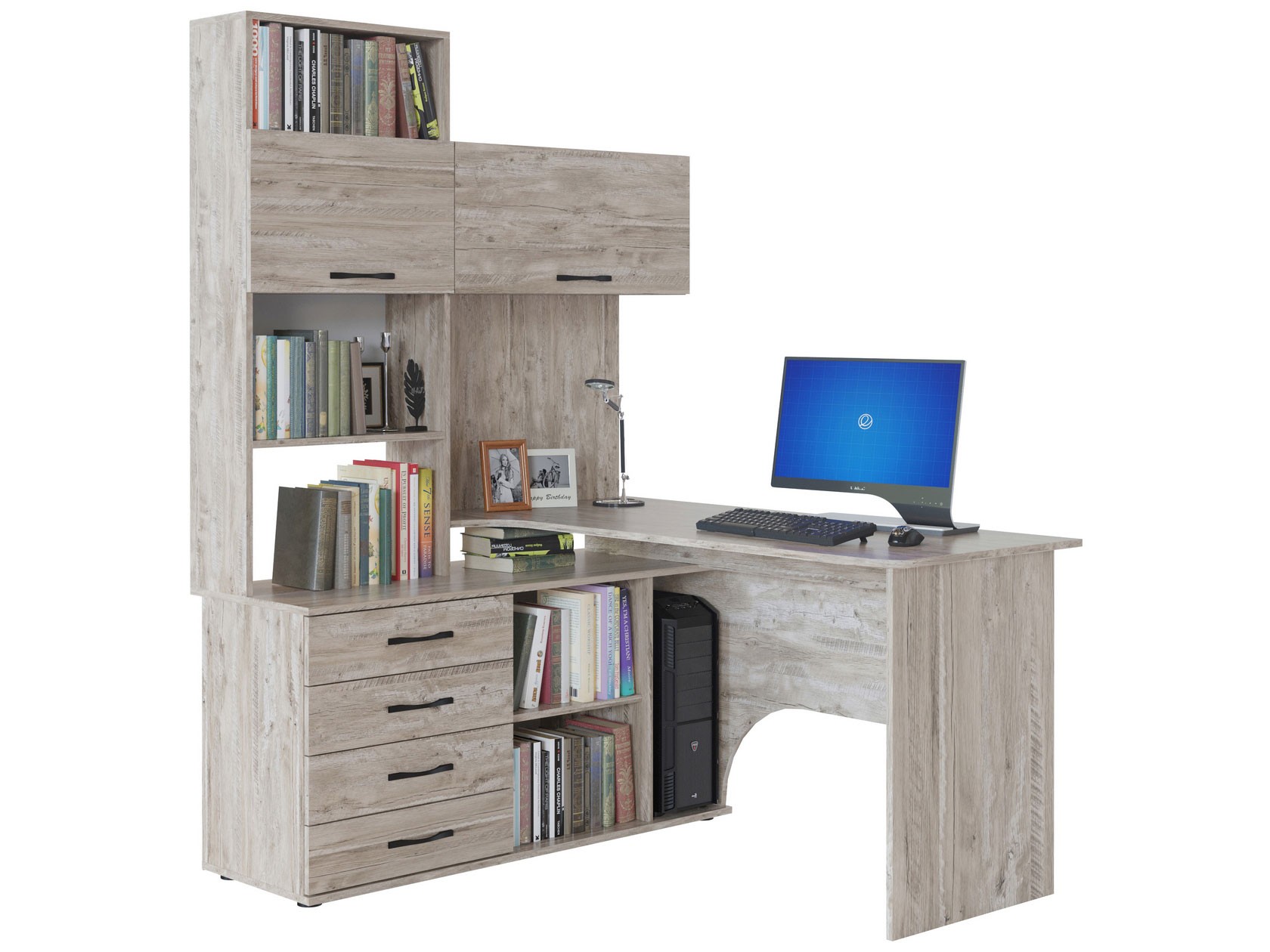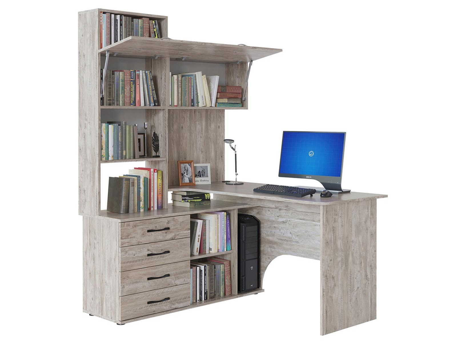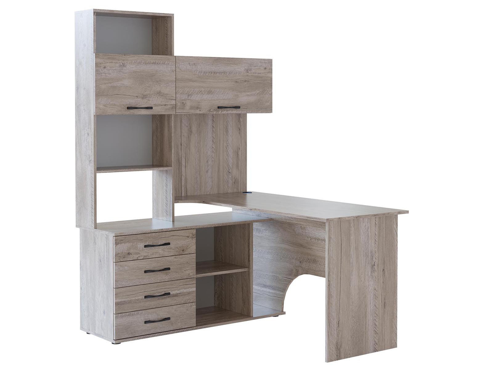 Многофункциональный компьютерный стол КСТ-14.1 для домашнего кабинета или офиса. Модель сочетает в себе широкий компьютерный стол с размером столешницы 1350 мм, тумбу с ящиками, полками и нишей под системный блок. Высокая надстройка имеет открытые полки и два закрытых шкафа. Двери шкафчиков открываются вверх. Внутренний размер ящиков — 456 х 346 мм. Преимущества:вместительный — большое количество полочек и ящиков позволяет хранить всю необходимую канцелярию в одном месте; стильный — впишется практически в любой интерьер и станет его украшением; широкий — размер столешницы составляет 1350 мм и позволяет поставить не только монитор, но другие предметы, необходимые для работы или учебы. Такая модель компьютерного стола позволяет организовать максимально удобную и функциональную рабочую зону. Изделие выполняется из ЛДСП толщиной 16 мм, края обработаны кромкой ПВХ 0,4 и 2 мм. Задняя стенка — ДВП серого цвета. Ручки выполнены из металла. На столешнице имеется отверстие под провода. В комплект входит заглушка. Рекомендуем сохранить инструкцию по сборке (паспорт изделия) до истечения гарантийного срока.