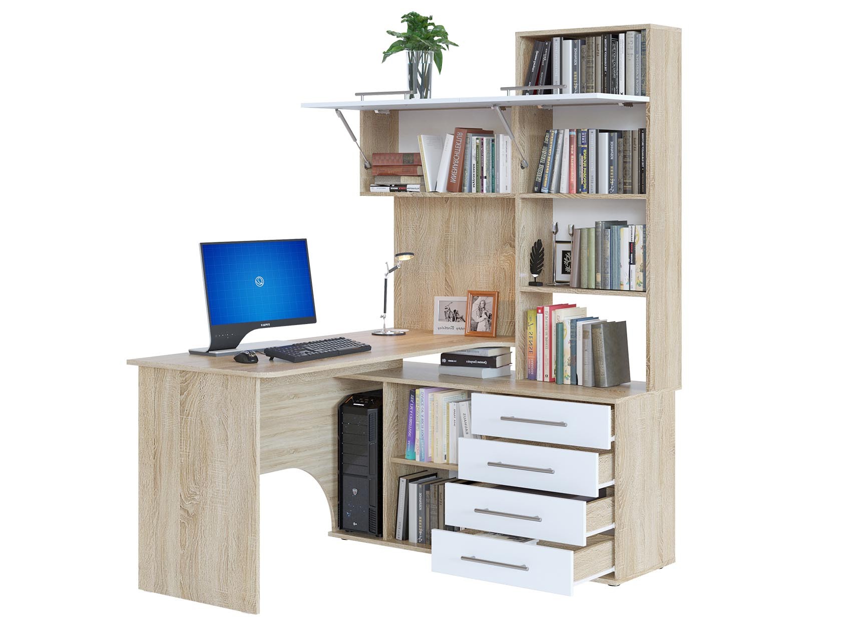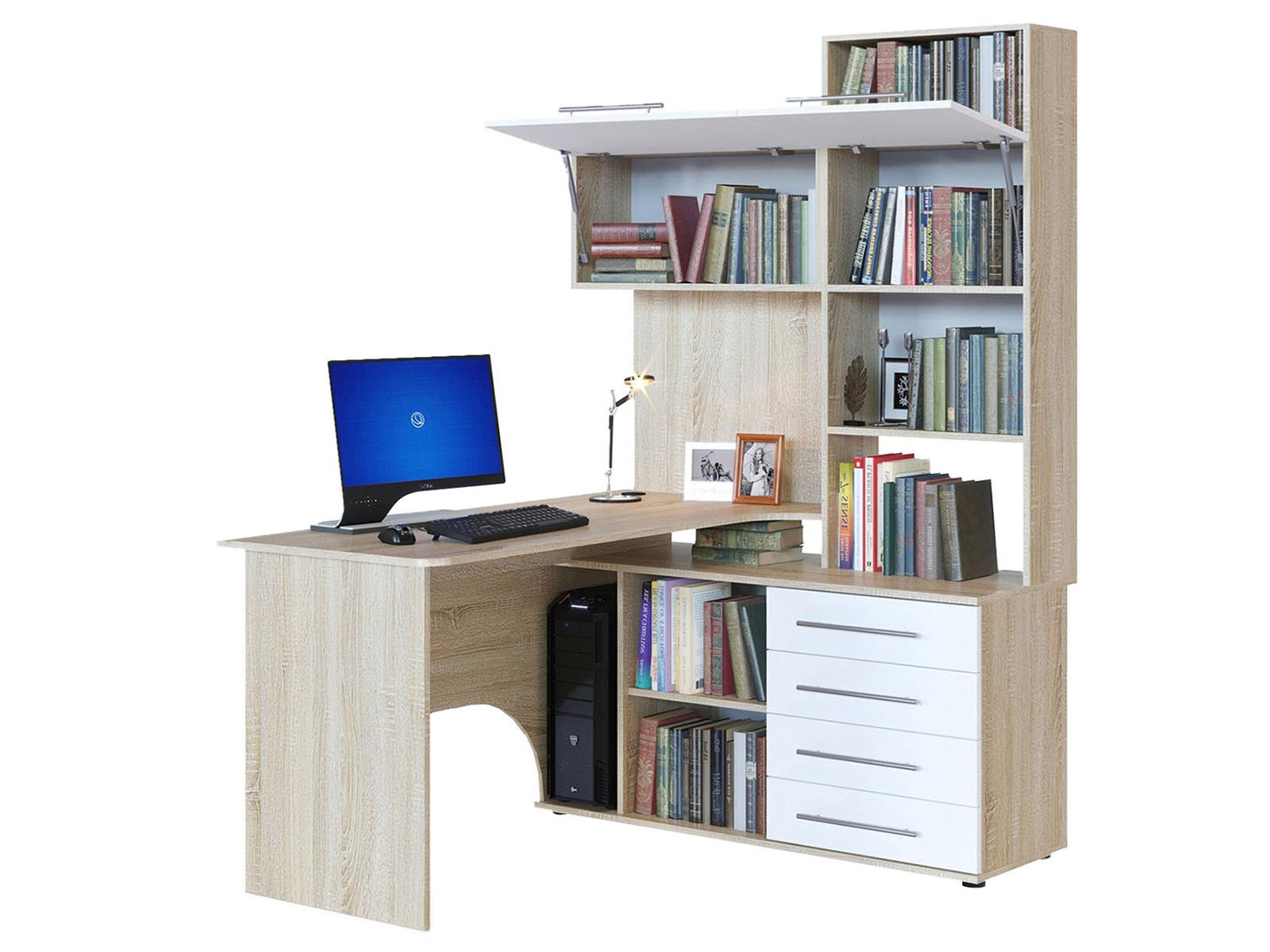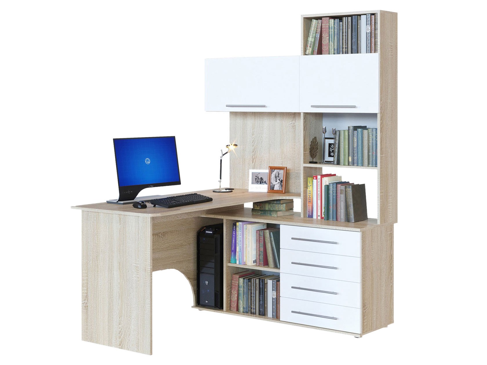 Многофункциональный компьютерный стол КСТ-14.1 для домашнего кабинета или офиса. Модель сочетает в себе широкий компьютерный стол с размером столешницы 1350 мм, тумбу с ящиками, полками и нишей под системный блок. Высокая надстройка имеет открытые полки и два закрытых шкафа. Двери шкафчиков открываются вверх. Внутренний размер ящиков — 456 х 346 мм. Преимущества:вместительный — большое количество полочек и ящиков позволяет хранить всю необходимую канцелярию в одном месте; стильный — впишется практически в любой интерьер и станет его украшением; широкий — размер столешницы составляет 1350 мм и позволяет поставить не только монитор, но другие предметы, необходимые для работы или учебы. Такая модель компьютерного стола позволяет организовать максимально удобную и функциональную рабочую зону. Изделие выполняется из ЛДСП толщиной 16 мм, края обработаны кромкой ПВХ 0,4 и 2 мм. Задняя стенка — ДВП серого цвета. Ручки выполнены из металла. На столешнице имеется отверстие под провода. В комплект входит заглушка. Рекомендуем сохранить инструкцию по сборке (паспорт изделия) до истечения гарантийного срока.