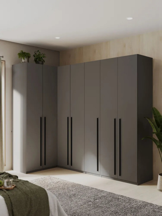 Угловая конструкция позволяет эффективно использовать пространство, предоставляя достаточно места для хранения одежды и аксессуаров. Шкаф оснащен двумя распашными дверцами и несколькими вместительными ящиками, что обеспечивает удобный доступ к вашим вещам.