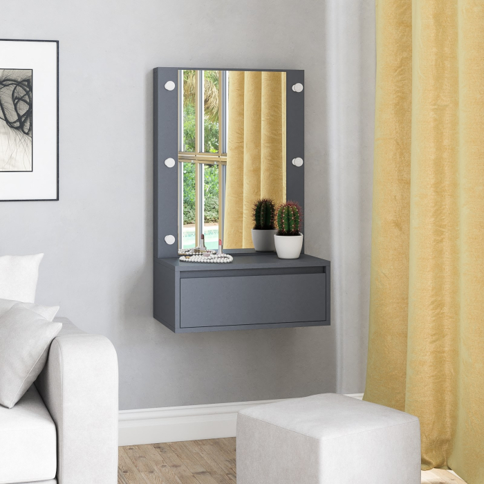 Столик крепится к стене, что позволяет установить его на любой удобной для вас высоте, обеспечивая максимальное удобство использования. Модель включает панель с зеркалом, которое создаёт эффект простора и яркости в помещении. Под столешницей расположен вместительный выдвижной ящик на шариковых направляющих, в котором удобно хранить косметику, аксессуары и другие нужные мелочи, сохраняя порядок на рабочей поверхности. Особенностью этого косметического стола являются отверстия для установки подсветки – по три с каждой стороны от зеркала. Это позволяет легко организовать равномерное освещение лица, что особенно важно при нанесении макияжа или выполнении уходовых процедур.