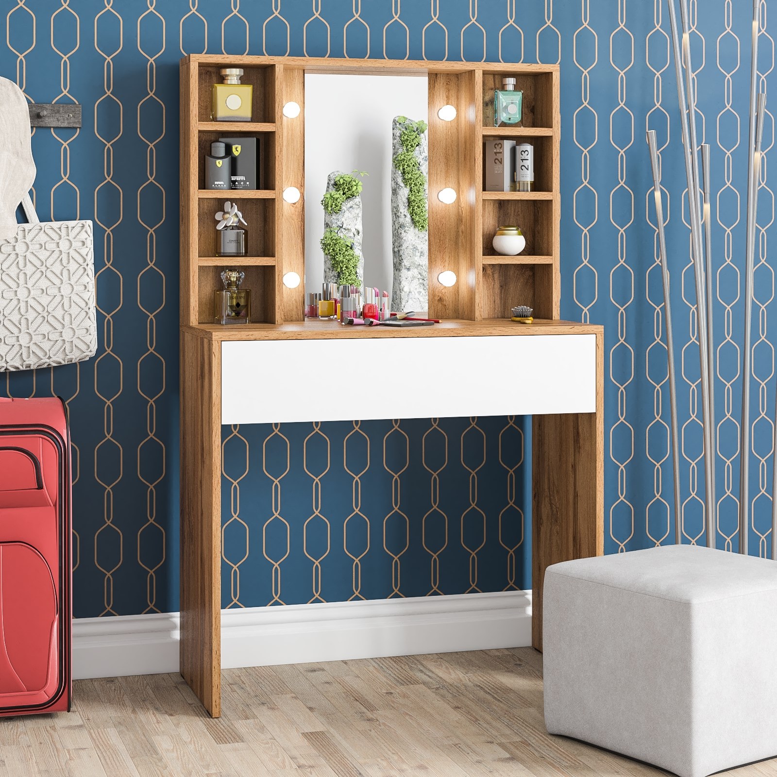 Зеркало расположено в центре композиции, создавая фокусную точку, которая привлекает внимание и помогает сделать утренние и вечерние бьюти-ритуалы более удобными. По бокам от зеркала расположены стойки с тремя аккуратными полочками с каждой стороны. Эти полочки предоставляют достаточно места для хранения косметики, парфюмерии и декоративных элементов. Благодаря продуманному расположению полочек, все необходимые аксессуары всегда будут под рукой, что добавляет удобства в использовании. Под столешницей размещен вместительный выдвижной ящик, который позволяет организовать пространство для хранения косметики, аксессуаров и других мелочей. Ящик на шариковых направляющих выдвигается плавно и бесшумно, обеспечивая лёгкий доступ ко всем необходимым предметам. Особенностью косметического стола являются отверстия для установки подсветки – по три с каждой стороны от зеркала. Это даёт возможность создать яркое и равномерное освещение, которое особенно важно при нанесении макияжа.
