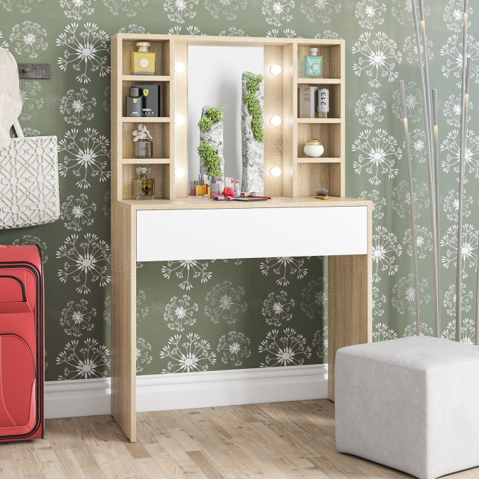 Зеркало расположено в центре композиции, создавая фокусную точку, которая привлекает внимание и помогает сделать утренние и вечерние бьюти-ритуалы более удобными. По бокам от зеркала расположены стойки с тремя аккуратными полочками с каждой стороны. Эти полочки предоставляют достаточно места для хранения косметики, парфюмерии и декоративных элементов. Благодаря продуманному расположению полочек, все необходимые аксессуары всегда будут под рукой, что добавляет удобства в использовании. Под столешницей размещен вместительный выдвижной ящик, который позволяет организовать пространство для хранения косметики, аксессуаров и других мелочей. Ящик на шариковых направляющих выдвигается плавно и бесшумно, обеспечивая лёгкий доступ ко всем необходимым предметам. Особенностью косметического стола являются отверстия для установки подсветки – по три с каждой стороны от зеркала. Это даёт возможность создать яркое и равномерное освещение, которое особенно важно при нанесении макияжа.