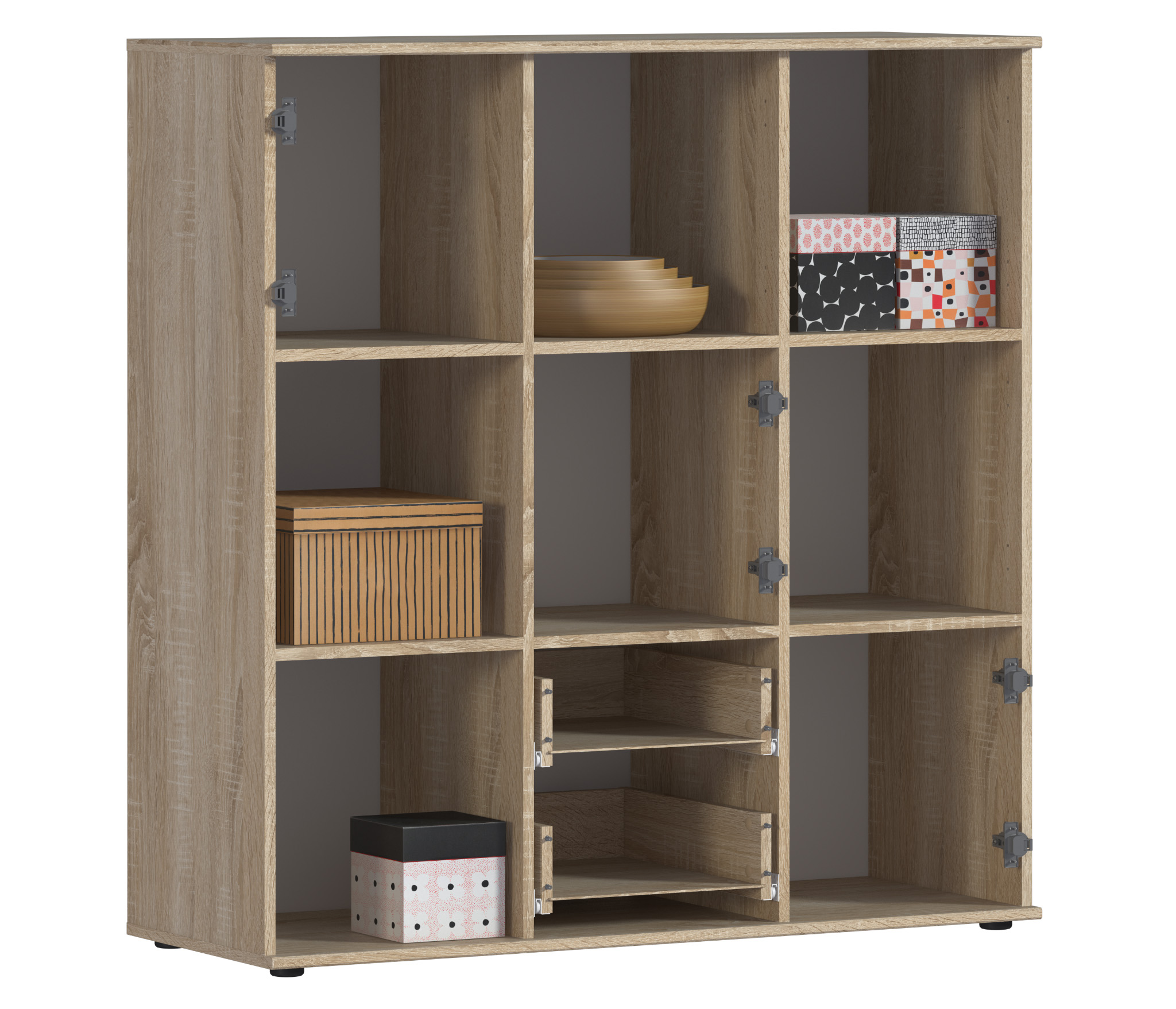 Модель производится из современного материала КДСП. Отделка комбинированная – корпус в цвете «Дуб Сонома», фасадные поверхности белые.