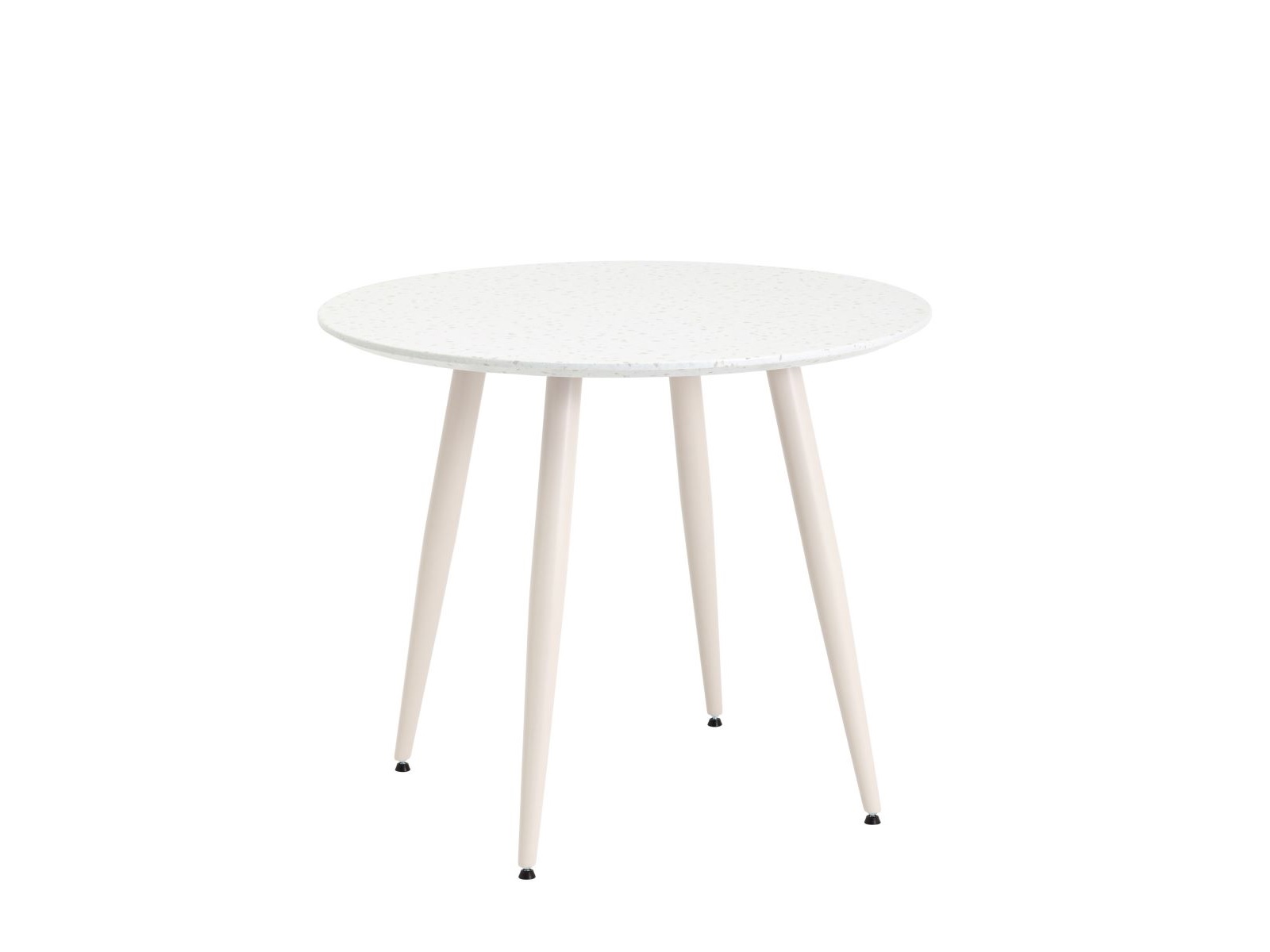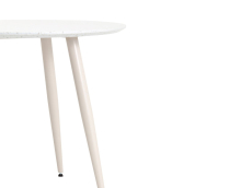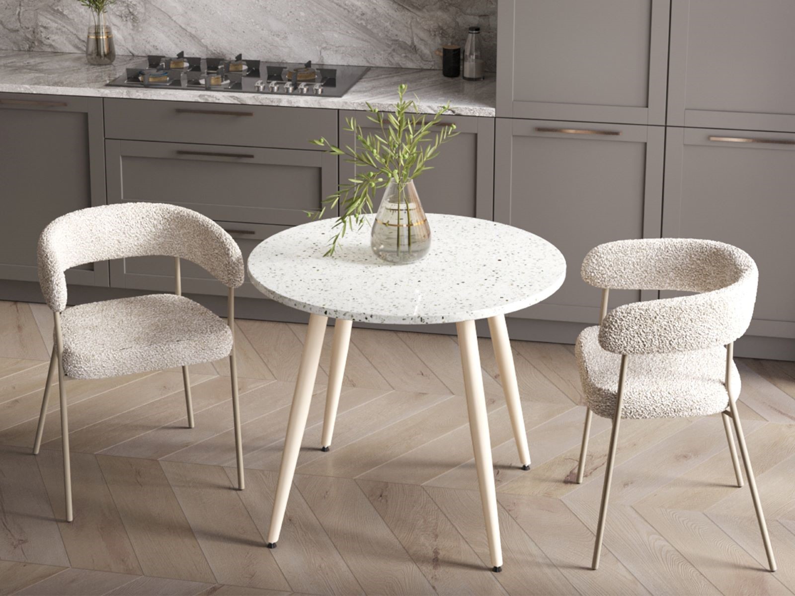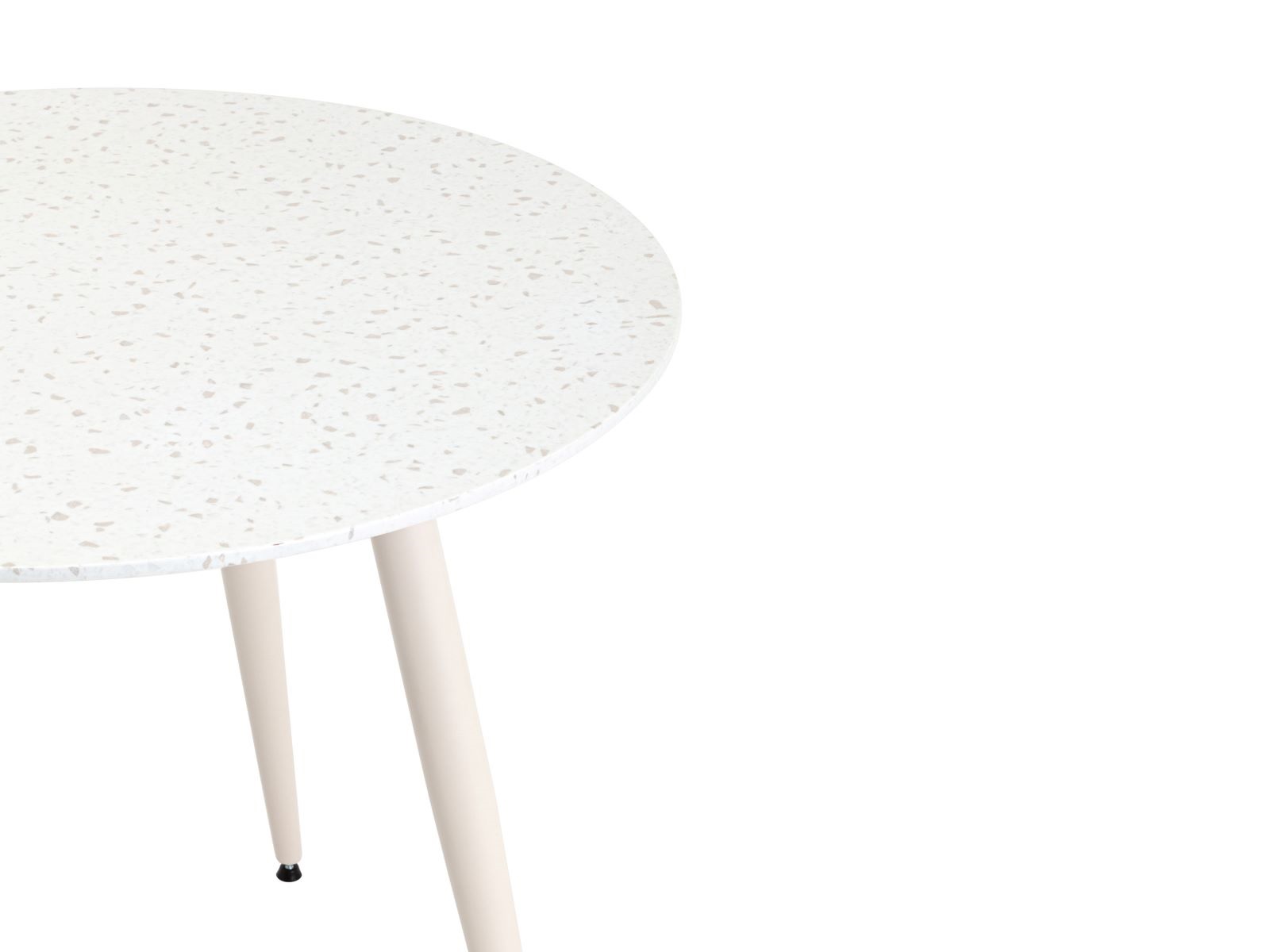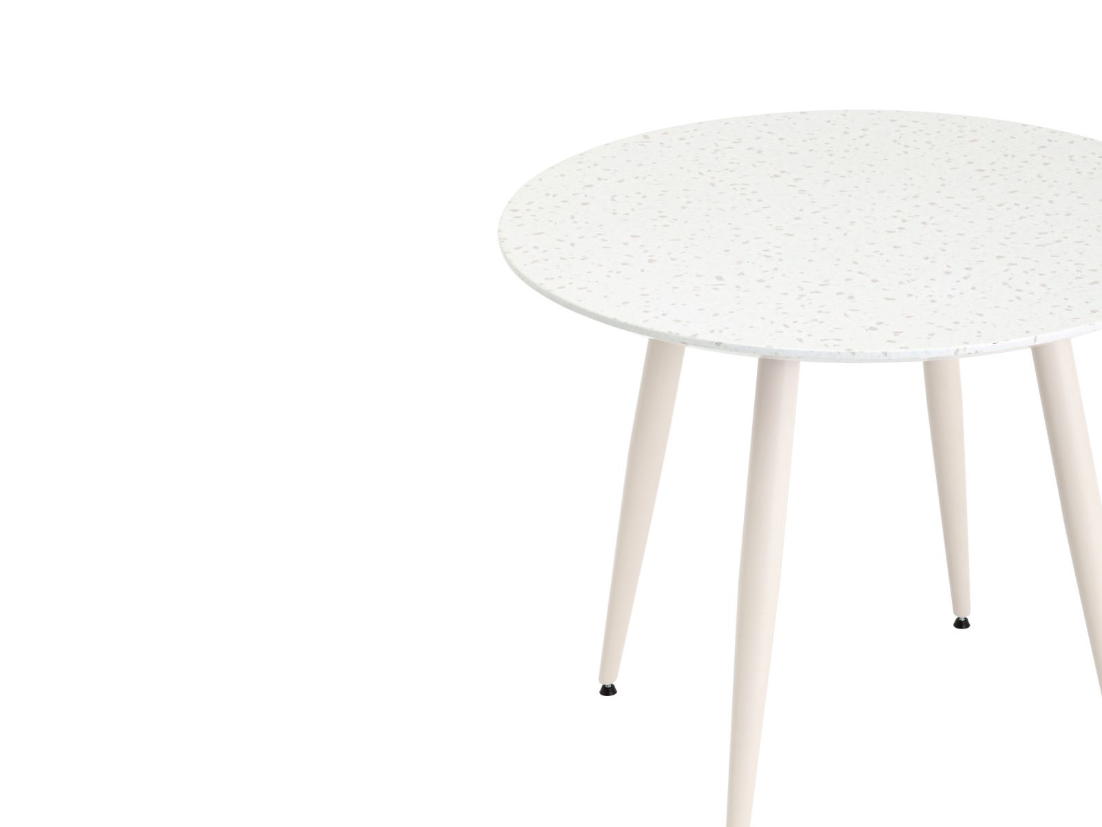 Nymphaea - стильный обеденный стол, который идеально дополнит вашу кухню, гостиную или террасу. Его ножки из металла обеспечивают прочность и устойчивость. Лаконичная столешница из МДФ круглой формы и диаметром 90 см, окрашенна в тераццо (мозаичный рисунок колотого камня, придающий поверхности дополнительный объем).