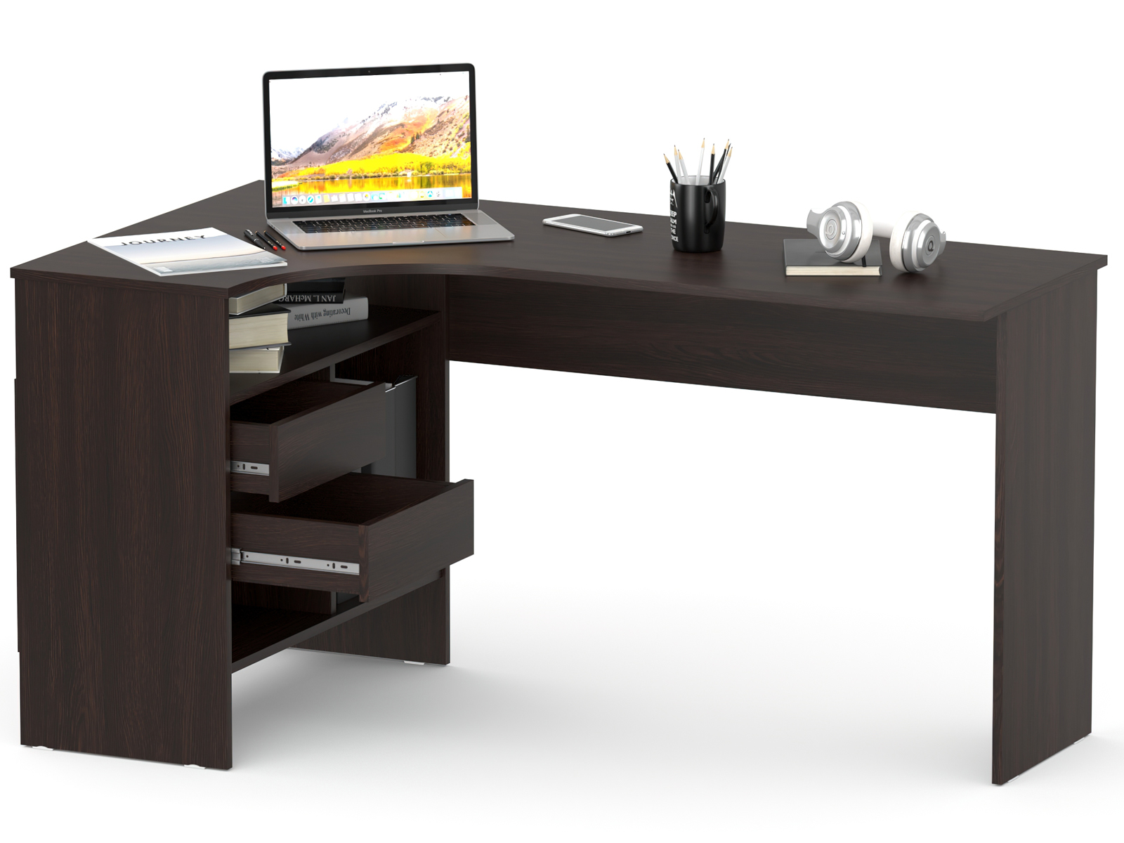 Угловой письменный стол СПм-25 — идеально решение для обустройства полноценного рабочего места в домашнем кабинете или офисе. На широкой столешнице найдется место для большого монитора, клавиатуры или ноутбука, а также сопутствующей техники. В выдвижных ящиках и открытых отделениях удобно хранить книги и канцелярию. Кроме того, конструкцией предусмотрена ниша под системный блок.