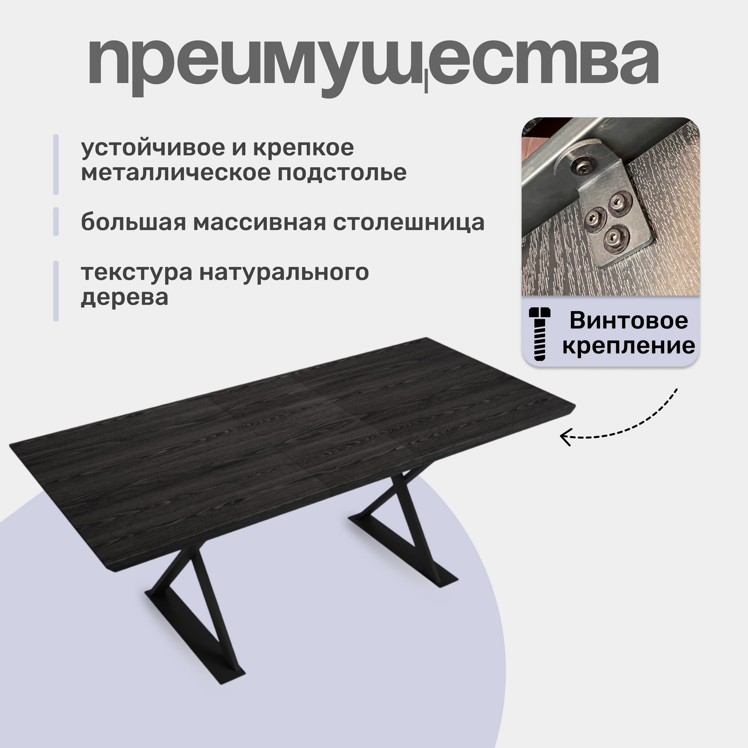 Высота стола достигает 75 см, что обеспечивает комфорт при использовании. Столешница толщиной 3,6 см выполнена из качественного МДФ, а насыщенный чёрный цвет с текстурой дерева добавляет элегантности и тепла, создавая уютную атмосферу для семейных встреч и подчеркивая ее современный вид. Подстолье, выполненное из матового металла, обеспечивает надежную опору и устойчивость конструкции. Ножки стола, изящно оформленные в форме песочных часов, добавляют нотку оригинальности и утонченности.