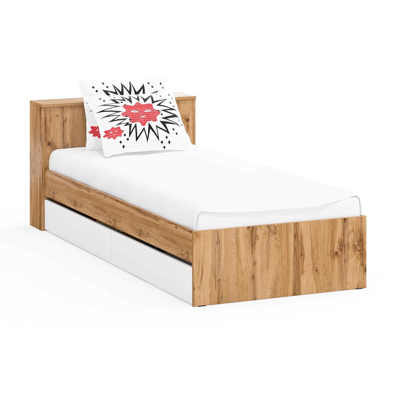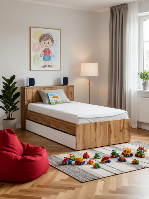 Компактная и продуманная конструкция идеально подходит как для детской, так и для небольшой спальни, гармонично сочетая стильный дизайн и высокую функциональность. Кровать имеет односпальное место 900×2000 мм с прочным основанием в комплекте. Матрас приобретается отдельно, позволяя выбрать оптимальный уровень жесткости и комфорта. В основании кровати предусмотрены два ящика на роликовых направляющих, которые обеспечивают легкое и бесшумное выдвижение. Это идеальное решение для хранения постельного белья, сезонной одежды или других вещей. Дополнительно в изголовье предусмотрена откидная панель с нишей, которая отлично подойдет для хранения книг, гаджетов и прочих мелочей, создавая удобное пространство для вечернего отдыха. Кровать имеет универсальную сборку, что позволяет расположить выдвижные ящики как с левой, так и с правой стороны, в зависимости от планировки комнаты.