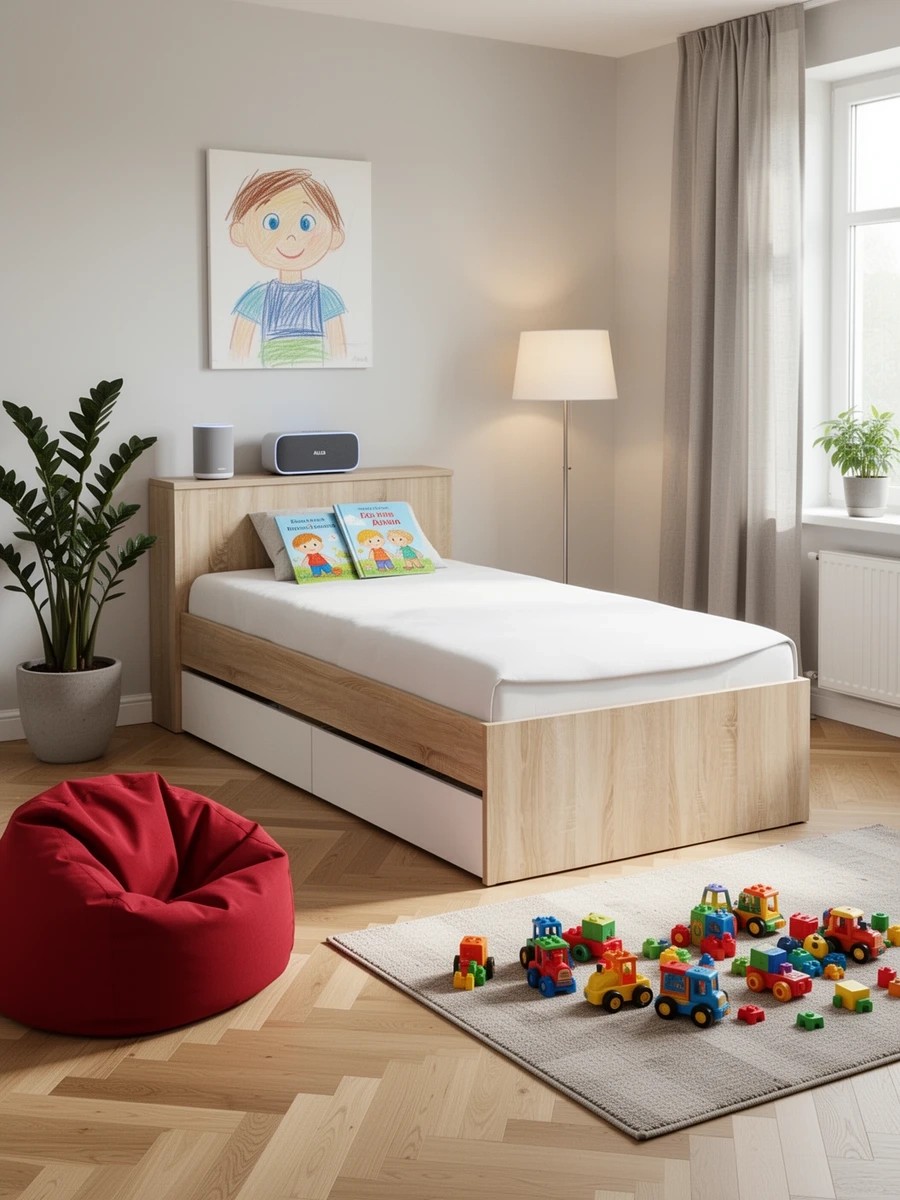 Компактная и продуманная конструкция идеально подходит как для детской, так и для небольшой спальни, гармонично сочетая стильный дизайн и высокую функциональность. Кровать имеет односпальное место 900×2000 мм с прочным основанием в комплекте. Матрас приобретается отдельно, позволяя выбрать оптимальный уровень жесткости и комфорта. В основании кровати предусмотрены два ящика на роликовых направляющих, которые обеспечивают легкое и бесшумное выдвижение. Это идеальное решение для хранения постельного белья, сезонной одежды или других вещей. Дополнительно в изголовье предусмотрена откидная панель с нишей, которая отлично подойдет для хранения книг, гаджетов и прочих мелочей, создавая удобное пространство для вечернего отдыха. Кровать имеет универсальную сборку, что позволяет расположить выдвижные ящики как с левой, так и с правой стороны, в зависимости от планировки комнаты.