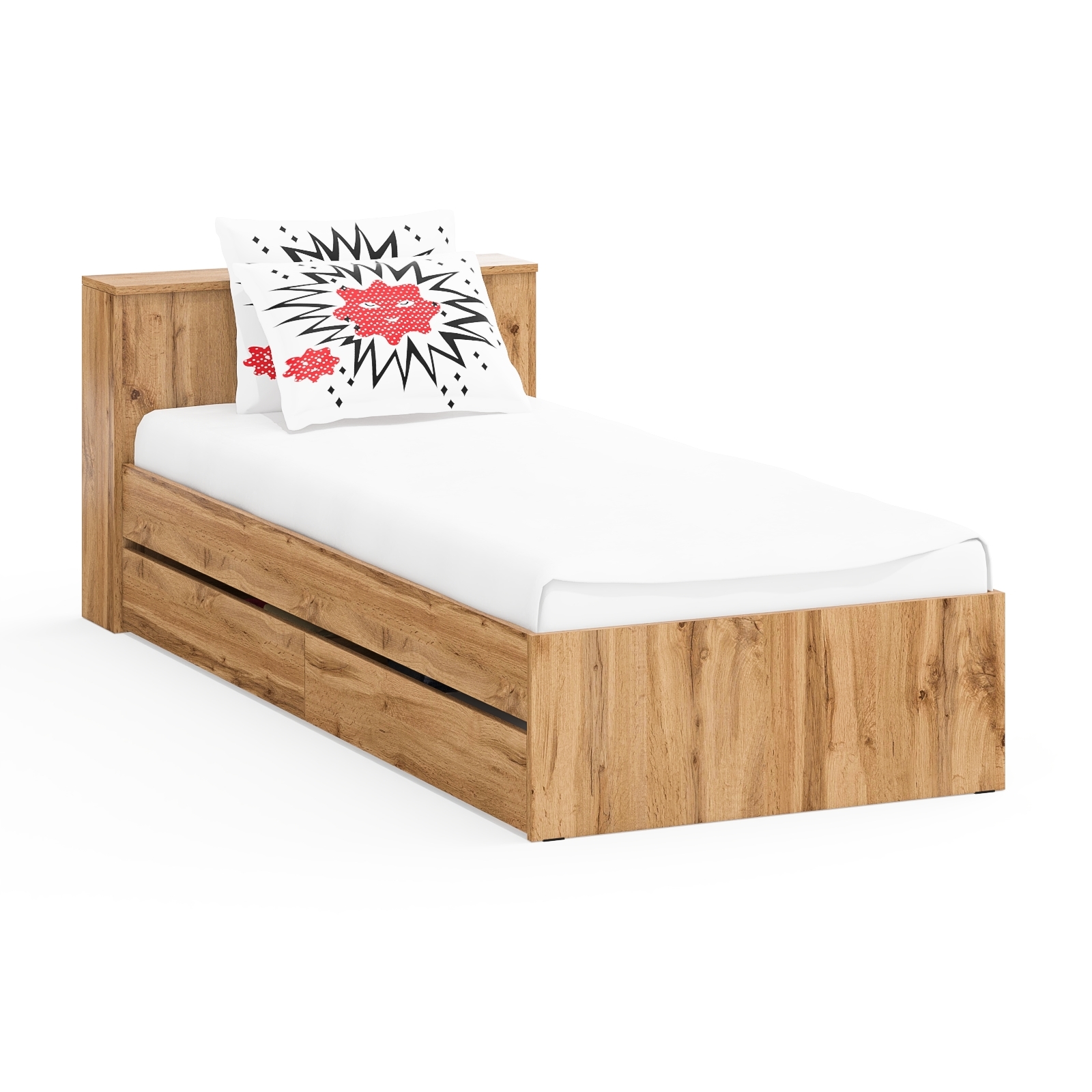Компактная и продуманная конструкция идеально подходит как для детской, так и для небольшой спальни, гармонично сочетая стильный дизайн и высокую функциональность. Кровать имеет односпальное место 900×2000 мм с прочным основанием в комплекте. Матрас приобретается отдельно, позволяя выбрать оптимальный уровень жесткости и комфорта. В основании кровати предусмотрены два ящика на роликовых направляющих, которые обеспечивают легкое и бесшумное выдвижение. Это идеальное решение для хранения постельного белья, сезонной одежды или других вещей. Дополнительно в изголовье предусмотрена откидная панель с нишей, которая отлично подойдет для хранения книг, гаджетов и прочих мелочей, создавая удобное пространство для вечернего отдыха. Кровать имеет универсальную сборку, что позволяет расположить выдвижные ящики как с левой, так и с правой стороны, в зависимости от планировки комнаты.