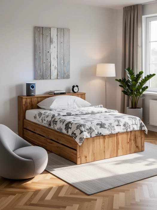 Кровать имеет односпальное место 1200×2000 мм с прочным основанием в комплекте. Матрас приобретается отдельно, позволяя выбрать оптимальный уровень жесткости и комфорта.