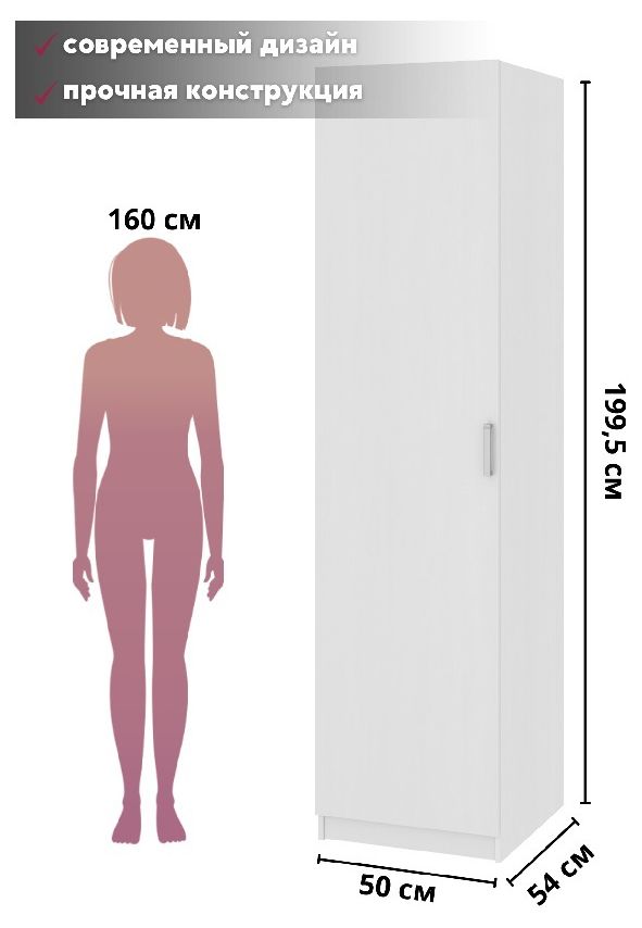 Шкаф имеет размеры 199,5 см в высоту, 50 см в ширину и 54 см в глубину. Это позволяет разместить его даже в небольших помещениях.