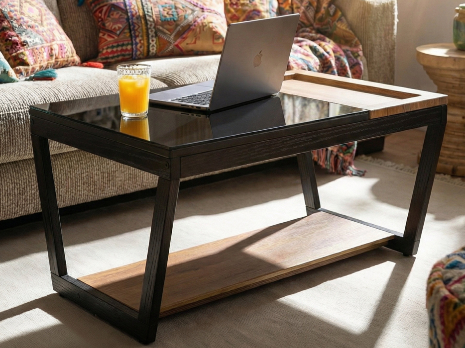 Журнальный стол BeautyStyle 31 — это идеальное сочетание контрастных материалов, создающее уникальный акцент в вашем доме или квартире. Прямоугольная столешница делится на две части: деревянная, выполненная из МДФ, покрытого защитной пленкой, и основная часть из прочного стекла. Деревянная часть столешницы представляет собой несъемный поднос с небольшими бортиками, что предотвращает возможность соскальзывания предметов. Это делает изделие не только стильным, но и практичным в использовании. Опоры из шпона березы обеспечивают устойчивость и надежность конструкции.