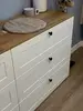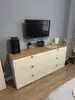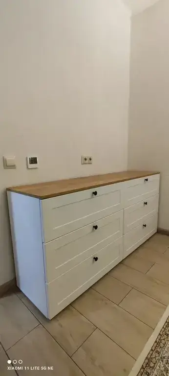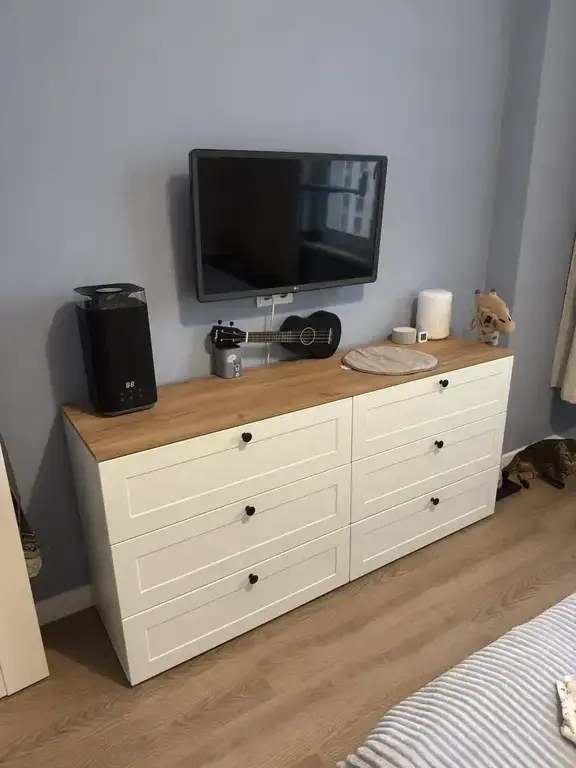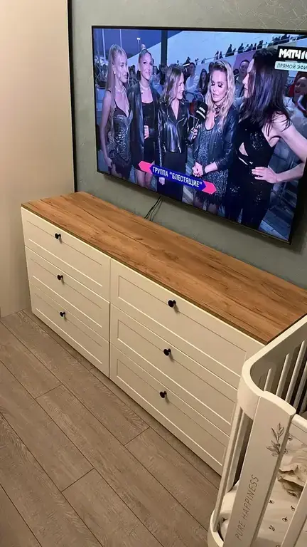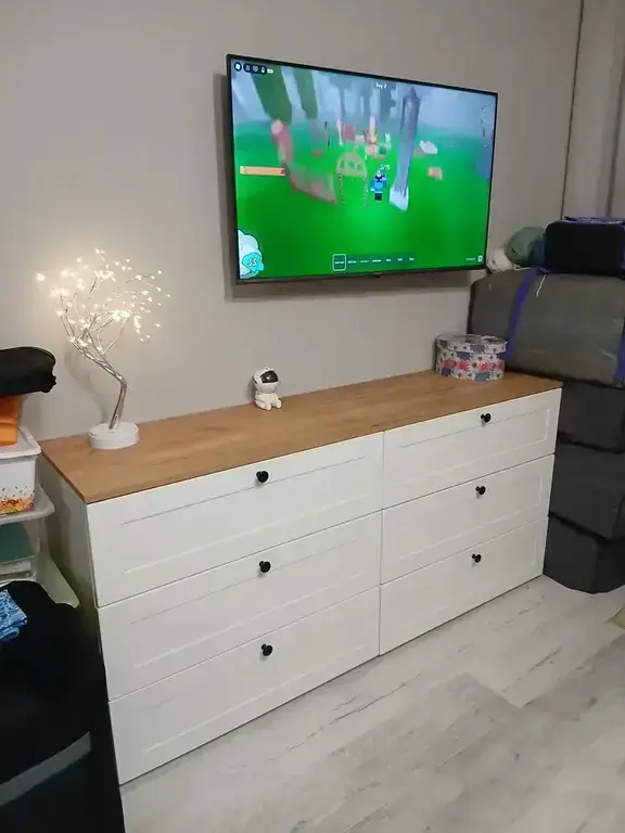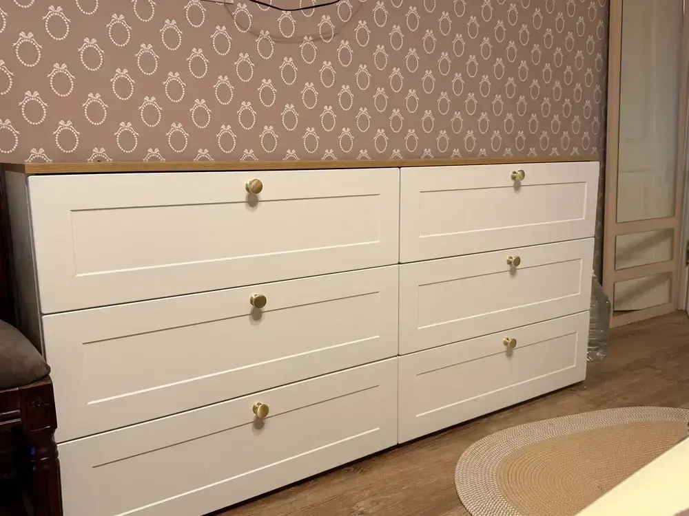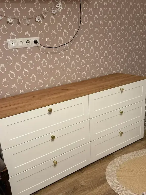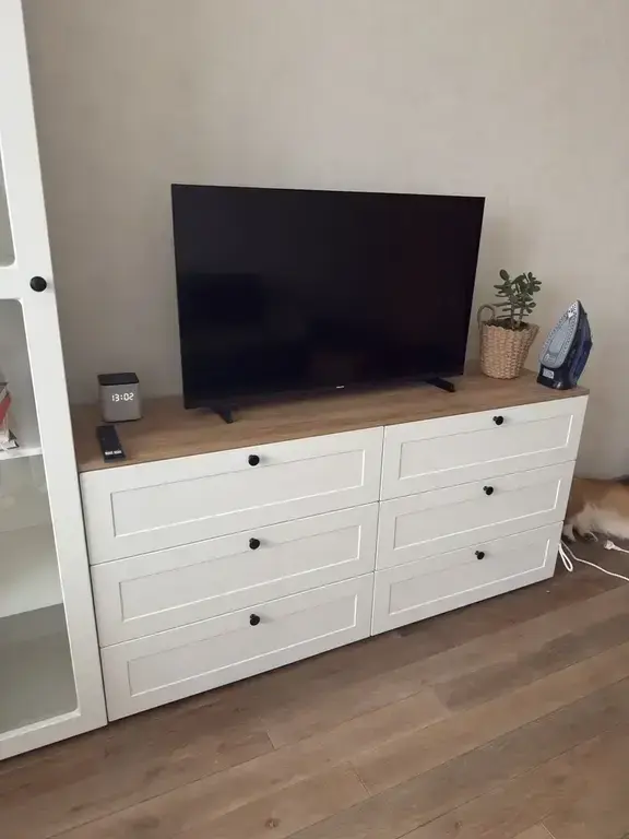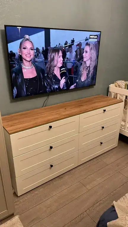 Комод оснащен шестью вместительными выдвижными ящиками на шариковых направляющих полного выдвижения. Размер каждого ящика — 726×336 мм, высота — 110 мм, полезная глубина — 33 см, что обеспечивает удобство хранения различных вещей. Эргономичные чёрные ручки из прочного пластика придают модели строгий и современный вид, подчёркивая стиль всей коллекции. Пластиковые опоры с регулировкой по высоте обеспечивают устойчивость комода даже на неровных поверхностях, сохраняя напольное покрытие от повреждений.
