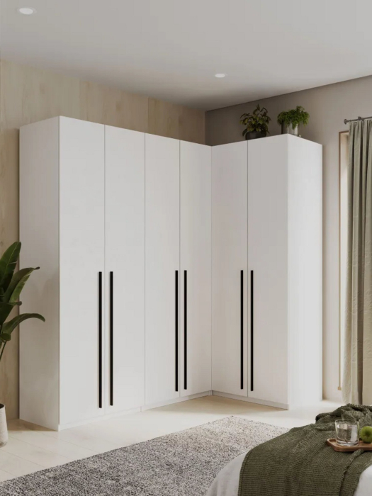 Представляем вашему вниманию угловой шкаф для одежды распашного типа, который станет прекрасным решением для вашего интерьера. Этот белый шкаф не только функционален, но и стильный. Его элегантный дизайн позволит органично вписаться в будь-якую комнату – будь то спальня, прихожая, детская или гостиная.
