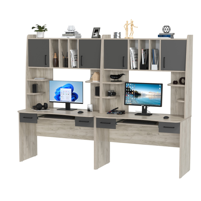 Каждый стол - стильный и функциональный помощник, который эффективно организует рабочее пространство. Благодаря удобным надстройкам и множеству полок, столы заменяют дополнительные шкафчики и полки, экономя место. Каждый стол помогает поддерживать порядок и организовать пространство для всех необходимых вещей. Столешницы с мягко закруглёнными краями безопасны и комфортны в использовании. Под столешницами расположены выдвижные ящики для канцелярии и удобные полки для клавиатуры, что упрощает доступ к необходимым вещам. Надстройки выполнены в виде стеллажей с двумя закрытыми отделениями с дверцами, открытыми полками и нишами с перегородками для удобного размещения книг и документов. Ниши под мониторы или ноутбуки расположены на оптимальной высоте, что способствует продуктивной работе и учёбе.