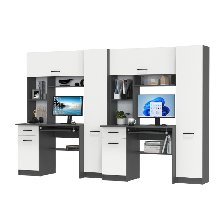 Эти универсальные и эргономичные столы сочетают в себе однотумбовый компьютерный стол с надстройкой и пеналом, что делает их практичными для учебы и игр. Местимость и функциональность каждого стола исключают необходимость в дополнительных шкафах и полках для работы или хранения вещей. Надстройка каждого стола предоставляет удобное место для размещения ноутбуков или мониторов, а многочисленные полки идеально подходят для книг, учебников и игрушек. Тумба каждого стола оснащена выдвижным ящиком и отделением с полкой, закрытым распашной дверкой, что позволяет эффективно хранить канцелярские принадлежности и другие вещи. Под столешницей каждого стола расположена выдвижная полка для клавиатуры, что позволяет сэкономить место на рабочем столе.