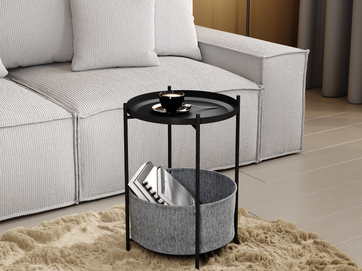 Каркас стола дополнен ёмкостью для хранения мелочей, а металлическая столешница имеет бортик по периметру. Уникальное сочетание металла и ткани придаёт столу универсальности в стилях оформления интерьеров. Главная особенность этой модели в том, что все детали стола съемные и могут использоваться отдельно друг от друга, к примеру съемная столешница может послужить подносом для еды, а корзину можно использоваться для хранения домашних предметов или детских игрушек.