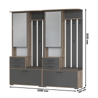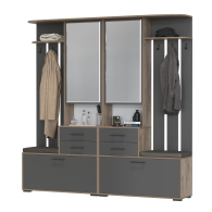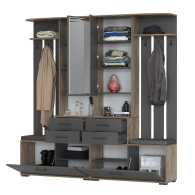Каждый комбинированный блок прихожей объединяет в себе - открытую вешалку, шкафчик с зеркальной дверцей, удобную тумбу для обуви и банкетку для комфортного переобувания. Открытая вешалка располагает 4-мя крючками и антресольной полочкой для головных уборов. За распашной дверкой зеркального шкафчика притаились три полочки. Не смотря на компактность, шкафчик порадует Вас вместительностью. В двух выдвижных ящичках тумбы достаточно места для нужных под рукой мелочей, ключей, перчаток, крема для обуви или дождевичка. За откидной дверкой тумбы для обуви расположены два отделения, одно для небольшой обуви, разделено горизонтальной полочкой на две части, второе - для высокой обуви. Половина верхнего горизонта тумбы для обуви выполнена в виде банкетки с мягким сиденьем, на которое удобно присесть. Комбинированный блок имеет универсальную сборку - Вы сможете собрать его с максимальным комфортом для себя. Уютная цветовая гамма внесёт в атмосферу дома спокойные интонации и умиротворение.
