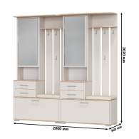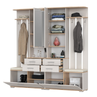 Каждый комбинированный блок прихожей объединяет в себе - открытую вешалку, шкафчик с зеркальной дверцей, удобную тумбу для обуви и банкетку для комфортного переобувания. Открытая вешалка располагает 4-мя крючками и антресольной полочкой для головных уборов. За распашной дверкой зеркального шкафчика притаились три полочки. Не смотря на компактность, шкафчик порадует Вас вместительностью. В двух выдвижных ящичках тумбы достаточно места для нужных под рукой мелочей, ключей, перчаток, крема для обуви или дождевичка. За откидной дверкой тумбы для обуви расположены два отделения, одно для небольшой обуви, разделено горизонтальной полочкой на две части, второе - для высокой обуви. Половина верхнего горизонта тумбы для обуви выполнена в виде банкетки с мягким сиденьем, на которое удобно присесть. Комбинированный блок имеет универсальную сборку - Вы сможете собрать его с максимальным комфортом для себя. Уютная цветовая гамма внесёт в атмосферу дома спокойные интонации и умиротворение.