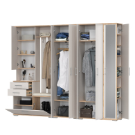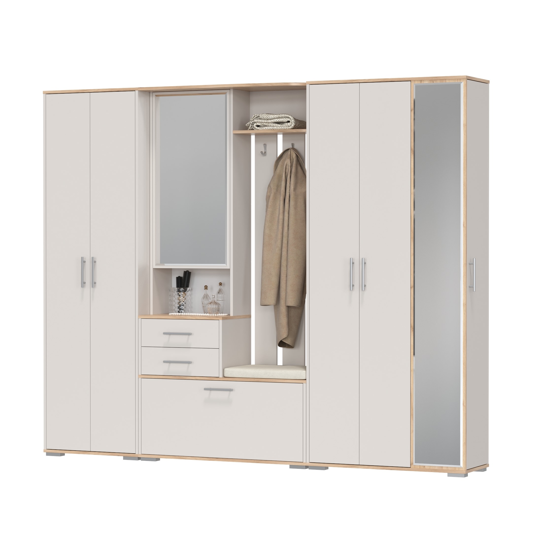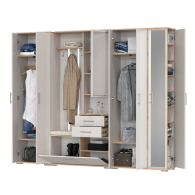 Комплектация состоит из двухстворчатого шкафа, шкафа с зеркалом в полный рост и комбинированного блока.