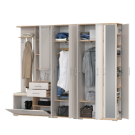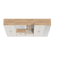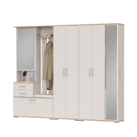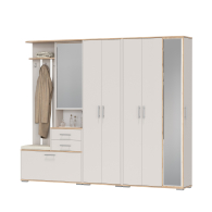 Комбинированный блок прихожей объединяет в себе - открытую вешалку, шкафчик с зеркальной дверцей, удобную тумбу для обуви и банкетку для комфортного переобувания. Открытая вешалка располагает 4-мя крючками и антресольной полочкой для головных уборов. За распашной дверкой зеркального шкафчика притаились три полочки. В двух выдвижных ящичках тумбы достаточно места для нужных под рукой мелочей, ключей, перчаток, крема для обуви или дождевичка. За откидной дверкой тумбы для обуви расположены два отделения, одно для небольшой обуви, разделено горизонтальной полочкой на две части, второе - для высокой обуви. Половина верхнего горизонта тумбы для обуви выполнена в виде банкетки с мягким сиденьем. Комбинированный блок имеет универсальную сборку.