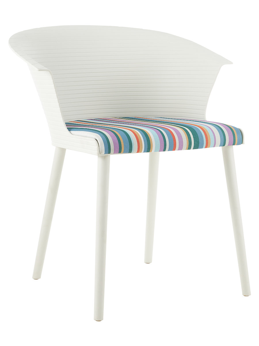 Стул выполнен из пластика, с мягким сиденьем из ткани. Подходит к использованию как для домашнего использования так и для кафе, баров, ресторанов, отелей