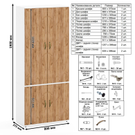 Дверки крепятся на четырёх-шарнирных петлях. В комплекте предусмотрены ручки-скобы длиной 110 мм в цвете античная бронза с крепёжными винтами. Мебель из ЛДСП толщиной 16 мм, края обработаны кромкой ПВХ. Поставляется мебель в разобранном виде.