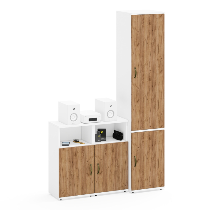 Комплектация включает две тумбы с открытыми нишами Лидер-8 2х3.19 и дверками Лидер-8 2х3.19, а также пенал с вешалкой и полкой Лидер-8 П21Б.