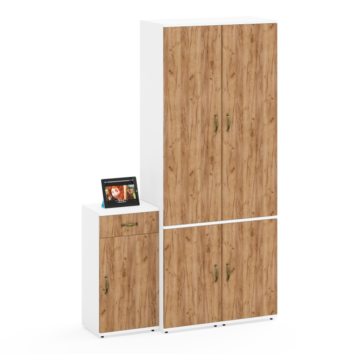 В комплекте два пенала П21Б, каждый пенал П21Б оснащен двумя отделениями за дверками - верхнее оборудовано выдвижной штангой, нижнее - полкой по центру. Тумба 3.15 с выдвижным ящиком сверху и дверкой является решением для размещения различных мелочей. Сторону открывания дверей пеналов и тумбы вы определяете при сборке.