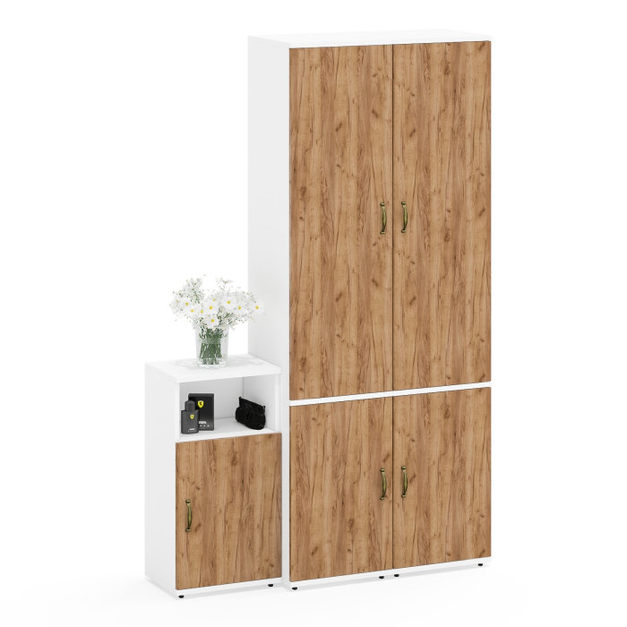 каждый пенал П22Б с двумя дверками и пятью полками идеально подходит для систематичного размещения книг, документов, аксессуаров или предметов декора. Тумба 3.19 оборудована открытой нишей сверху и отделением с полкой за распашной дверкой. Сторону открывания дверей тумбы и пеналов вы определяете при сборке.