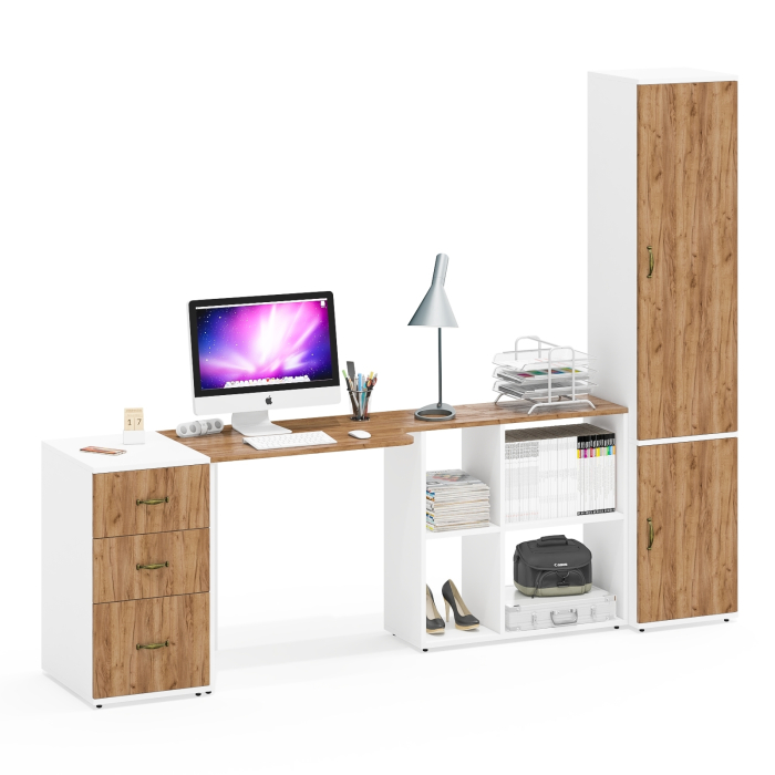 Стол-трансформер СтТ предлагает два варианта сборки - угловой (115х50/80х75 см) или прямой (165х50/30х75 см), что позволяет оптимально использовать доступное пространство. Встроенная тумба стола с четырьмя полками обеспечивает удобное хранение документов и канцелярских принадлежностей. Тумба 3.16 оснащена тремя ящиками - два компактных сверху и один вместительный снизу, все на шариковых направляющих. Пенал П22Б с двумя дверками и пятью полками идеально подходит для систематичного размещения книг, документов, аксессуаров или предметов декора.