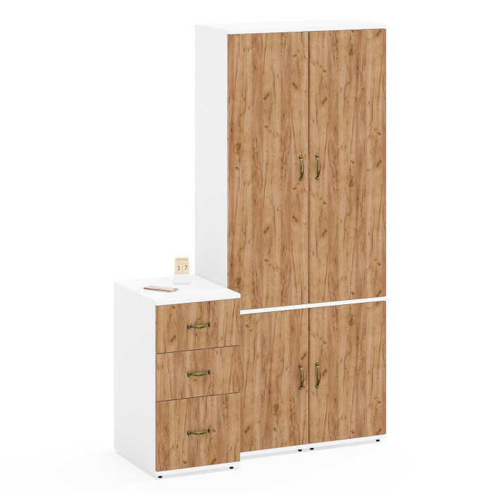 каждый пенал П22Б с двумя дверками и пятью полками идеально подходит для систематичного размещения книг, документов, аксессуаров или предметов декора. Тумба 3.16 оснащена тремя ящиками - два компактных сверху и один вместительный снизу, все на шариковых направляющих. Сторону открывания дверей пеналов вы определяете при сборке.