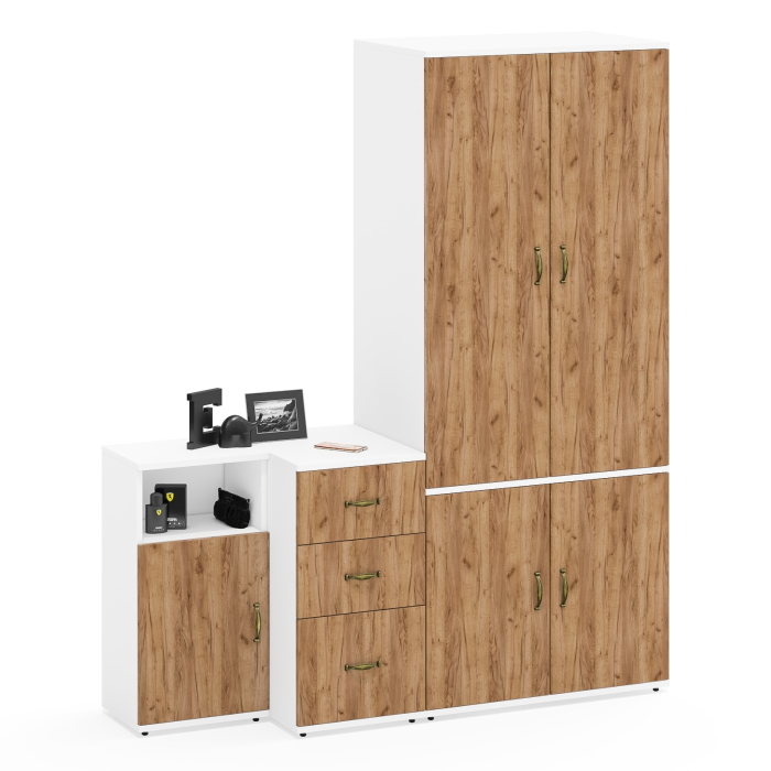 Комплектация состоит из шкафа Лидер-8 Ш19Б, тумбы с тремя ящиками Лидер-8 3.16 и тумбы с нишей и дверкой Лидер-8 3.19.