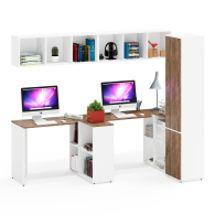 Каждый стол-трансформер СтТ предлагает два варианта сборки - угловой (115х50/80х75 см) или прямой (165х50/30х75 см), что позволяет оптимально использовать доступное пространство. Встроенная тумба каждого стола с четырьмя полками обеспечивает удобное хранение документов и канцелярских принадлежностей. Каждая открытая навесная полка разделена на 3 отделения вертикальными перегородками. Навесная полка может крепиться горизонтально или вертикально. Пенал П22Б с двумя дверками и пятью полками идеально подходит для систематичного размещения книг, документов, аксессуаров или предметов декора.