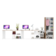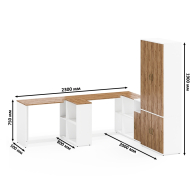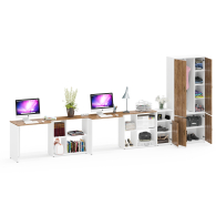 Каждый стол-трансформер СтТ предлагает два варианта сборки - угловой (115х50/80х75 см) или прямой (165х50/30х75 см), что позволяет оптимально использовать доступное пространство. Встроенная тумба каждого стола с четырьмя полками обеспечивает удобное хранение документов и канцелярских принадлежностей. Шкаф Ш20Б состоит из двух отделений за распашными дверками. Верхнее отделение - слева – выдвижная штанга, что экономит пространство и облегчает доступ, справа – три полки и открытая ниша снизу, идеально подходящие для хранения аксессуаров, обуви, сумок или декоративных элементов. Нижнее отделение оснащено полкой по центру вещей. Справа – три полки и открытая ниша снизу, подходящие для хранения аксессуаров, обуви, сумок или декоративных элементов. Нижнее отделение оснащено полкой по центру. Тумба 3.19 оборудована открытой нишей сверху и отделением с полкой за распашной дверкой.
