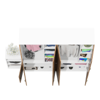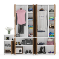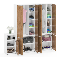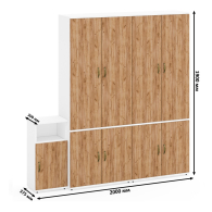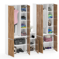 Каждый шкаф Ш20Б состоит из двух отделений. Верхнее отделение у каждого шкафа разделено на две зоны, слева – выдвижная штанга , что экономит пространство и облегчает доступ. Справа – три полки и открытая ниша снизу, подходящие для хранения аксессуаров, обуви, сумок или декоративных элементов. Нижнее отделение оснащено полкой по центру. Тумба 3.19 оборудована открытой нишей сверху и отделением с полкой за распашной дверкой. В данной модели шкафа нет универсальной сборки. Сторону открывания двери тумбы вы определяете при сборке.
