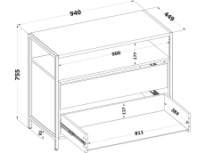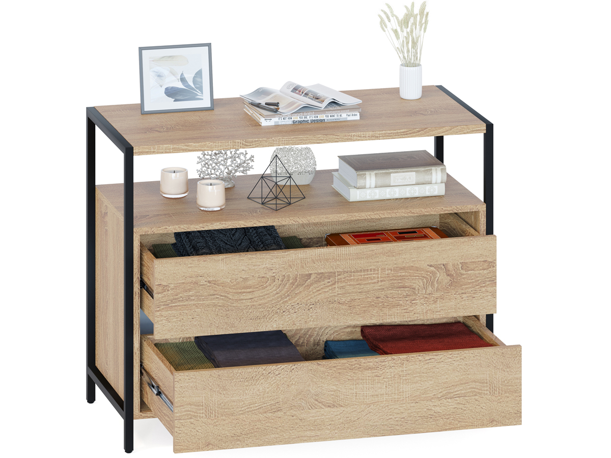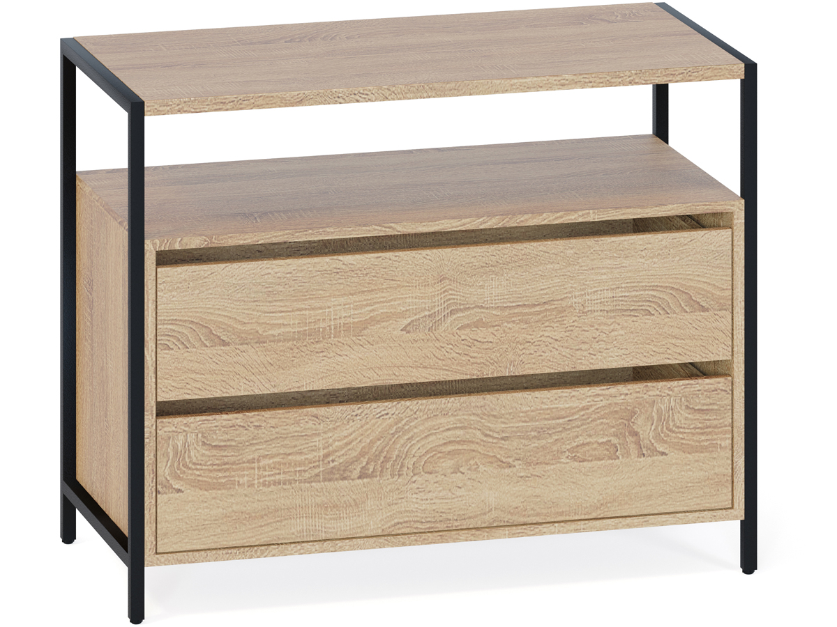 Функциональный комод Т-400 — оптимальное решение для тех, кому нужно организовать хранение вещей в гостиной, спальне или прихожей, используя пространство максимально эффективно. Рабочая поверхность шириной 940 мм и глубиной 449 мм позволит с комфортом разместить большой телевизор и предметы декора даже в самой маленькой комнате. За счет интересного решения с металлическим каркасом на регулируемых подпятниках и деталям толщиной 22 мм с противоударной кромкой создается современная обстановка в стиле лофт. Открытая ниша под столешницей обеспечит легкий доступ к предметам первой необходимости и сделает комод визуально легким, а два вместительных выдвижных ящика разместят все необходимые личные вещи, одежду и белье.
