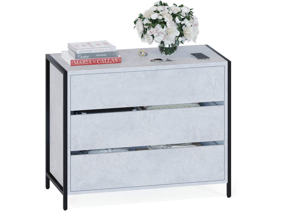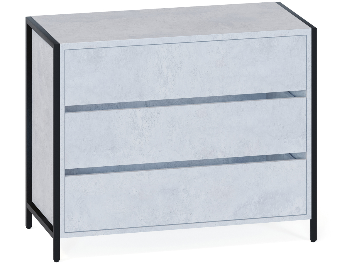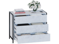 Комод Т-401 в стиле лофт — вместительная система хранения для современной спальни, гостиной или прихожей. Модель смотрится эффектно благодаря черному металлокаркасу на регулируемых подпятниках и деталям толщиной 22 мм с противоударной кромкой. Рабочая поверхность шириной 940 мм и глубиной 449 мм позволит с комфортом разместить большой телевизор и предметы декора, при этом эффективно задействуя пространство комнаты. Для хранения документов, белья и личных вещей предусмотрены три вместительных выдвижных ящика. Их плавное и бесшумное открывание обеспечивают надежные шариковые направляющие, а вместо привычных ручек сделаны стильные вырезы между фасадами.