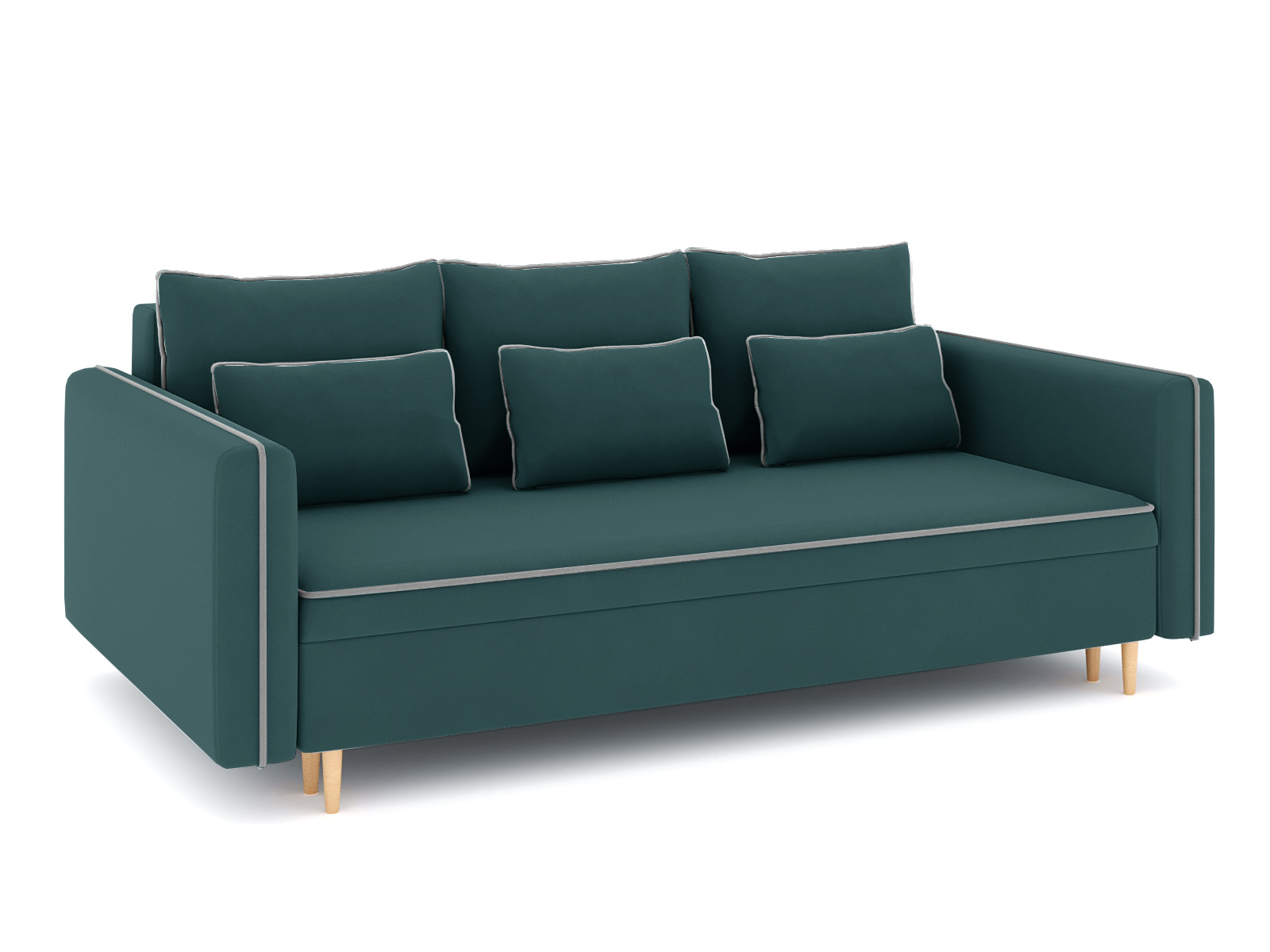 Механизм трансформации еврокнижка-пантограф. Наполнение высокоэластичный ППУ. Жесткость-средняя. Чехол больших подушек съемный, наполнение-крошка ППУ. Каркас ДСП, ДВП, ЛДСП, фанера, брус хвойных пород. Спальное место 1950х1440. Ящик для белья есть. Опоры массив березы. Высота опоры 150мм. Высота сиденья 420мм. Глубина сиденья без подушек 760мм. В комплекте 3 большие подушки и 3 декоративные.