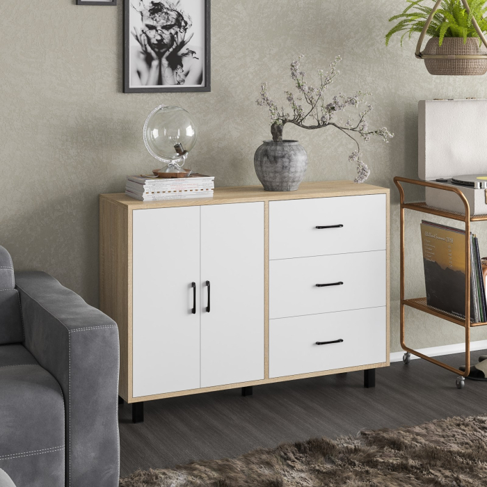 Комод-тумба может использоваться не только для хранения, но и как стильная ТВ-тумба, которая подчеркнет современный дизайн вашего интерьера. Комод оснащен просторным и продуманным функционалом. Слева находится пара распашных дверок (732х284 мм), за которыми предусмотрена полка для аккуратного размещения вещей. Справа три одинаковых выдвижных ящика. Размер фасадов ящиков составляет 242х570 мм, что обеспечивает достаточную вместимость. Ящики оборудованы шариковыми направляющими длиной 350 мм, что обеспечивает плавное и тихое выдвижение.