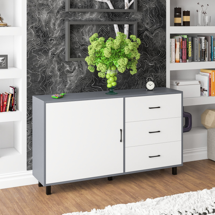 Комод-тумба может использоваться не только для хранения, но и как стильная ТВ-тумба, которая подчеркнет современный дизайн вашего интерьера. Комод оснащен просторным и продуманным функционалом. Слева находится распашная дверка (732х786 мм), за которой предусмотрена полка для аккуратного размещения вещей. Справа три одинаковых выдвижных ящика. Размер фасадов ящиков составляет 242х654 мм, что обеспечивает достаточную вместимость. Комод установлен на пять металлических опор черного цвета высотой 100 мм, придающие конструкции устойчивость и современный внешний вид.