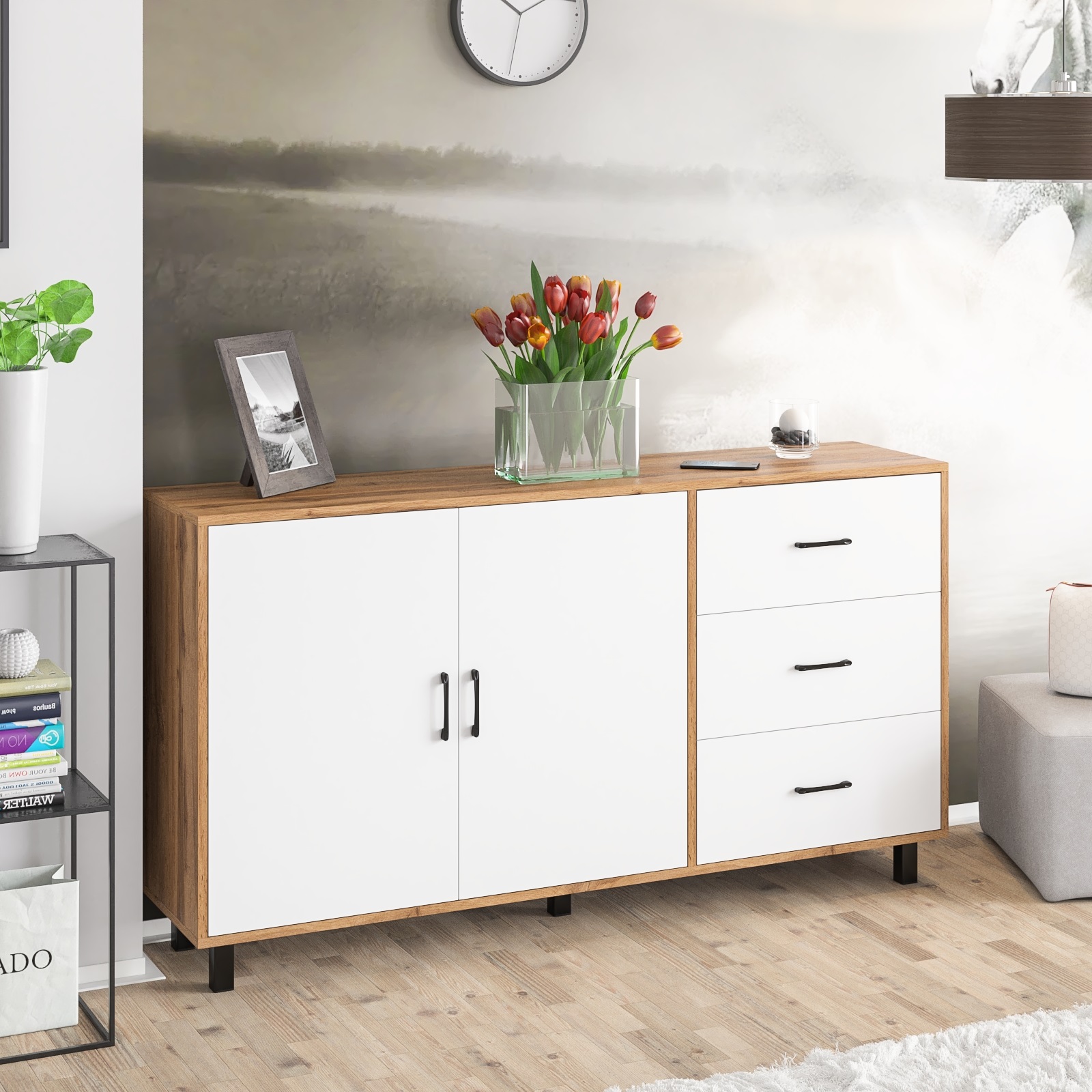 Тумба-комод может использоваться не только для хранения, но и как стильная ТВ-тумба, которая подчеркнет современный дизайн вашего интерьера. Комод оснащен просторным и продуманным функционалом. Слева находится пара распашных дверок (732х484 мм), за которыми предусмотрена полка для аккуратного размещения вещей. Справа три одинаковых выдвижных ящика. Размер фасадов ящиков составляет (242х570 мм), что обеспечивает достаточную вместимость. Ящики оборудованы шариковыми направляющими длиной 350 мм, что обеспечивает плавное и тихое выдвижение.