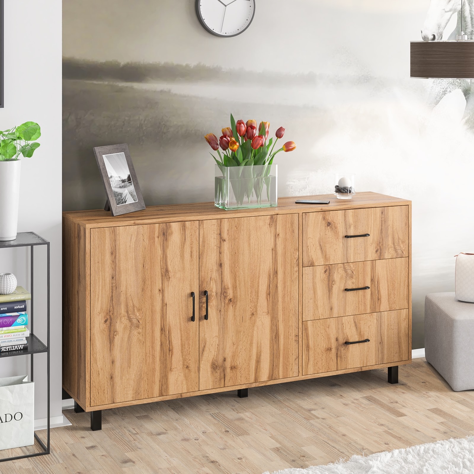 Тумба-комод может использоваться не только для хранения, но и как стильная ТВ-тумба, которая подчеркнет современный дизайн вашего интерьера. Комод оснащен просторным и продуманным функционалом. Слева находится пара распашных дверок (732х484 мм), за которыми предусмотрена полка для аккуратного размещения вещей. Справа три одинаковых выдвижных ящика. Размер фасадов ящиков составляет (242х570 мм), что обеспечивает достаточную вместимость. Ящики оборудованы шариковыми направляющими длиной 350 мм, что обеспечивает плавное и тихое выдвижение.