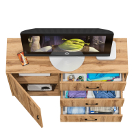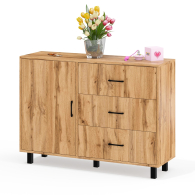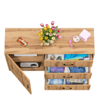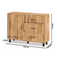 Для удобства открывания двери и ящиков используются стильные металлические ручки длиной 128 мм черного цвета, которые гармонично дополняют общий дизайн. Корпус и фасады выполнены из высококачественной ламинированной ДСП толщиной 16 мм, а торцы надежно обработаны ПВХ-кромкой. Задняя стенка и дно ящиков изготовлены из ламинированной ДВП, что добавляет долговечности конструкции. Обратите внимание, что комод не имеет универсальной сборки - дверка расположена только слева, а ящики – справа. Поставляется в разобранном виде.