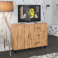 Комод-тумба может использоваться не только для хранения, но и как стильная ТВ-тумба, которая подчеркнет современный дизайн вашего интерьера. Комод оснащен просторным и продуманным функционалом. Слева находится распашная дверка (732х486 мм), за которой предусмотрена полка для аккуратного размещения вещей. Справа три одинаковых выдвижных ящика. Размер фасадов ящиков составляет (242х654 мм), что обеспечивает достаточную вместимость. Комод установлен на пять металлических опор черного цвета высотой 100 мм, придающие конструкции устойчивость и современный внешний вид.