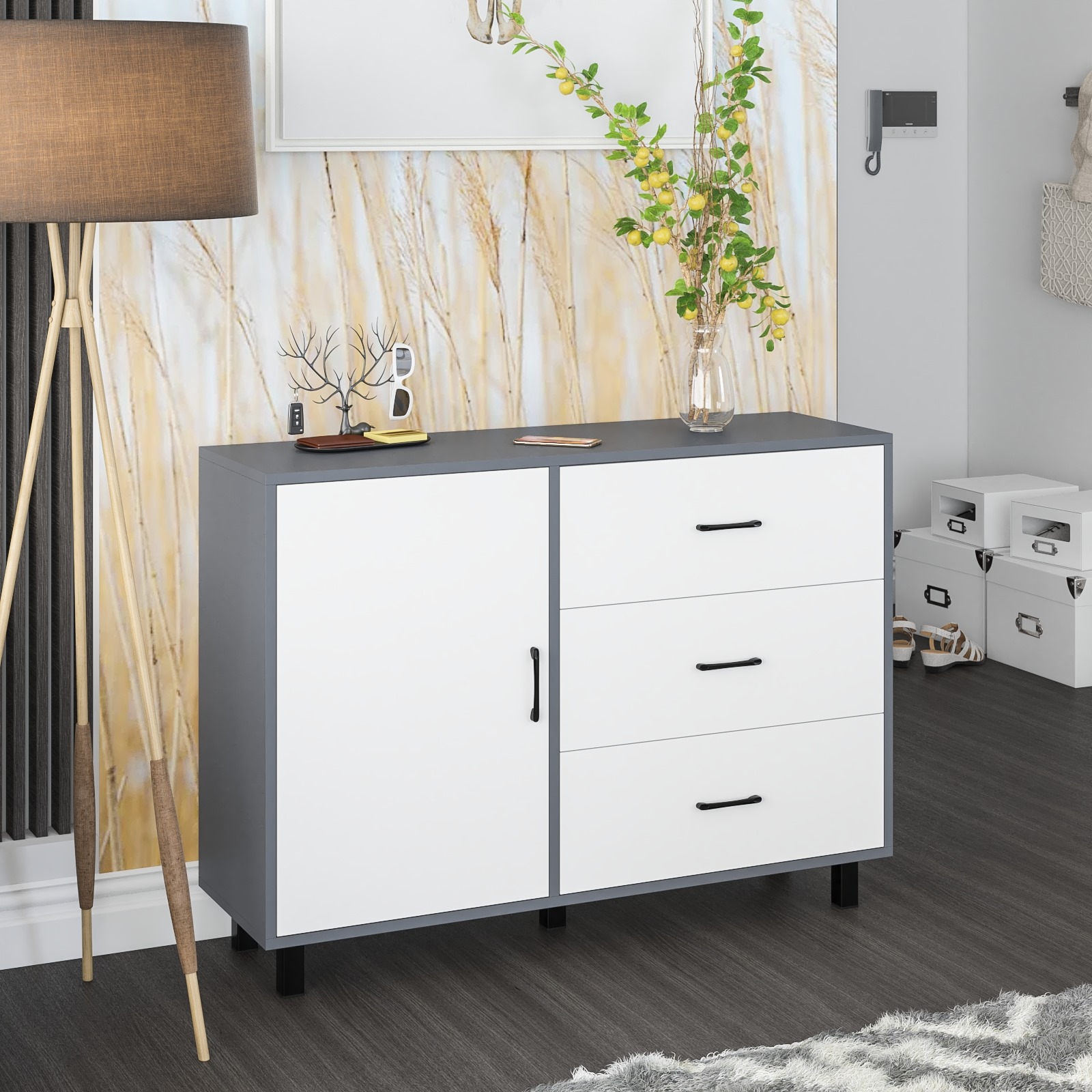 Комод-тумба может использоваться не только для хранения, но и как стильная ТВ-тумба, которая подчеркнет современный дизайн вашего интерьера. Комод оснащен просторным и продуманным функционалом. Слева находится распашная дверка (732х486 мм), за которой предусмотрена полка для аккуратного размещения вещей. Справа три одинаковых выдвижных ящика. Размер фасадов ящиков составляет (242х654 мм), что обеспечивает достаточную вместимость. Комод установлен на пять металлических опор черного цвета высотой 100 мм, придающие конструкции устойчивость и современный внешний вид.