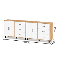 Два комода РВК 123-1204 могут использоваться не только для хранения, но и как стильная ТВ-тумба, которая подчеркнет современный дизайн вашего интерьера. В комплекте 2 комода, объединенных в единый блок. Каждый комод оснащен просторным и продуманным функционалом. Слева у каждого комода находится пара распашных дверок (732х284 мм), за которыми предусмотрена полка для аккуратного размещения вещей. Справа у каждого комода расположены 3 одинаковых выдвижных ящика. Размер фасадов ящиков составляет 242х570 мм, что обеспечивает достаточную вместимость. Ящики оборудованы шариковыми направляющими длиной 350 мм, что обеспечивает плавное и тихое выдвижение.