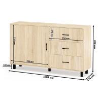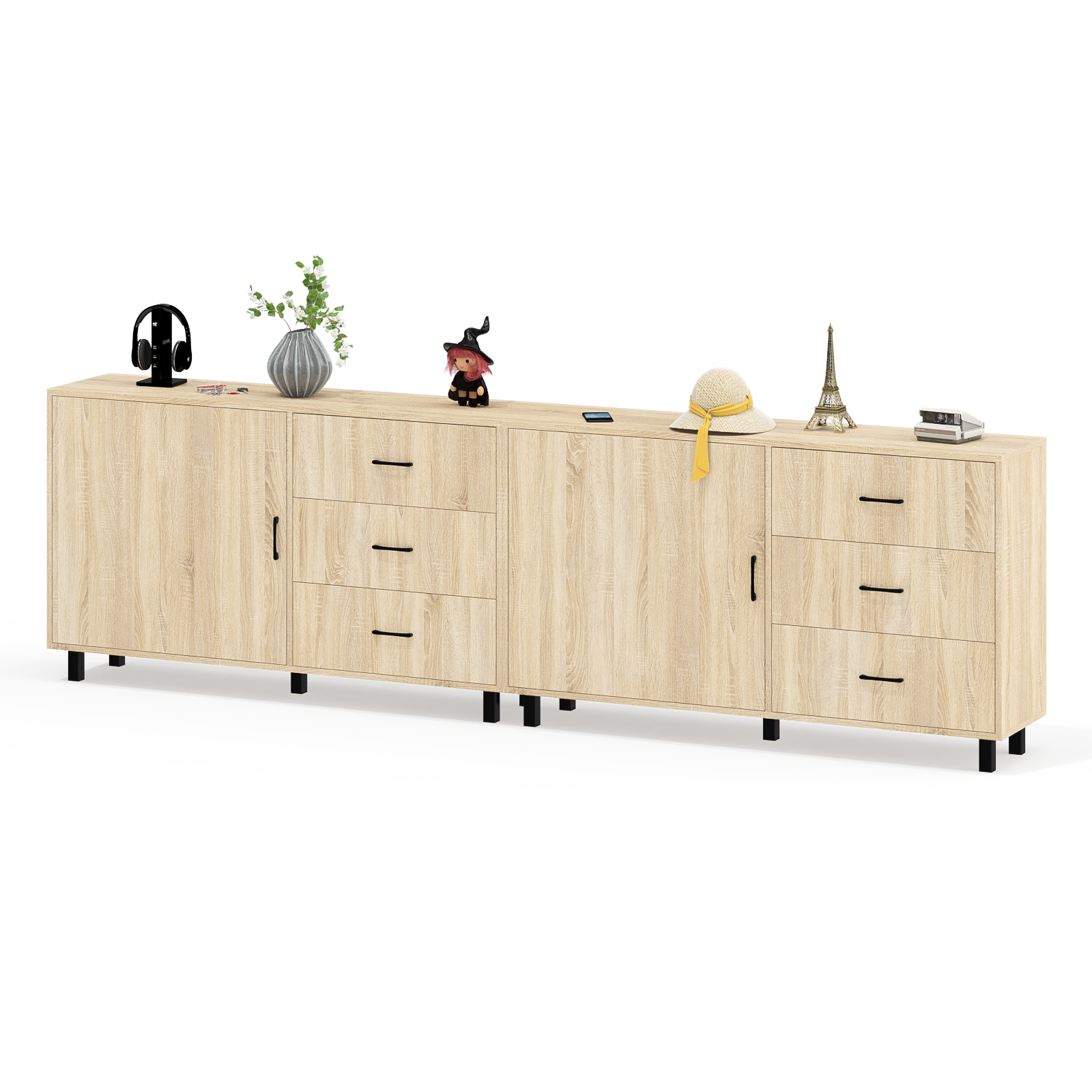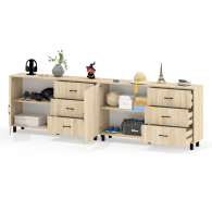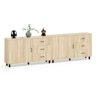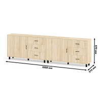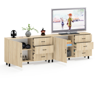 Тумба-комод может использоваться не только для хранения, но и как стильная ТВ-тумба, которая подчеркнет современный дизайн вашего интерьера. В комплекте две тумбы-комода, объединенных в единый блок. Каждый комод оснащен просторным и продуманным функционалом. Слева у каждой тумбы-комода находится распашная дверка (732х786 мм), за которой предусмотрена полка для аккуратного размещения вещей. Справа у каждой тумбы-комода расположены три одинаковых выдвижных ящика. Размер фасадов ящиков составляет 242х654 мм, что обеспечивает достаточную вместимость. Каждая тумба-комод установлена на пять металлических опор черного цвета высотой 100 мм, придающие конструкции устойчивость и современный внешний вид. Для удобства открывания двери и ящиков используются стильные металлические ручки длиной 128 мм черного цвета, которые гармонично дополняют общий дизайн.