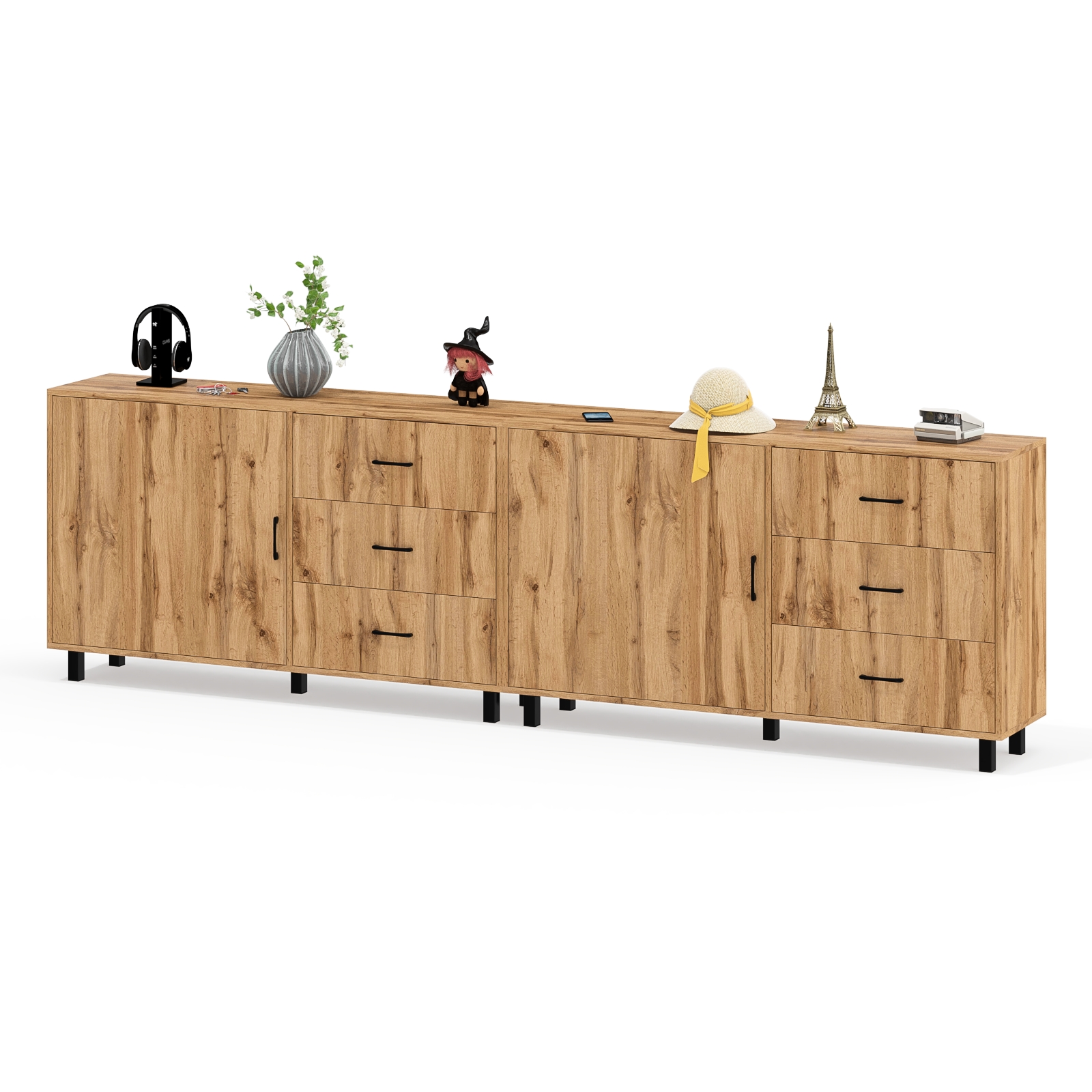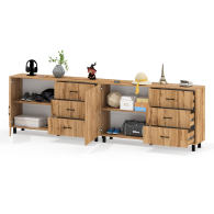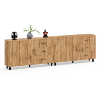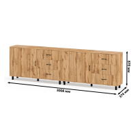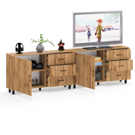 Тумба-комод может использоваться не только для хранения, но и как стильная ТВ-тумба, которая подчеркнет современный дизайн вашего интерьера. В комплекте две тумбы-комода, объединенных в единый блок. Каждый комод оснащен просторным и продуманным функционалом. Слева у каждой тумбы-комода находится распашная дверка (732х786 мм), за которой предусмотрена полка для аккуратного размещения вещей. Справа у каждой тумбы-комода расположены три одинаковых выдвижных ящика. Размер фасадов ящиков составляет 242х654 мм, что обеспечивает достаточную вместимость. Каждая тумба-комод установлена на пять металлических опор черного цвета высотой 100 мм, придающие конструкции устойчивость и современный внешний вид. Для удобства открывания двери и ящиков используются стильные металлические ручки длиной 128 мм черного цвета, которые гармонично дополняют общий дизайн.